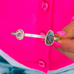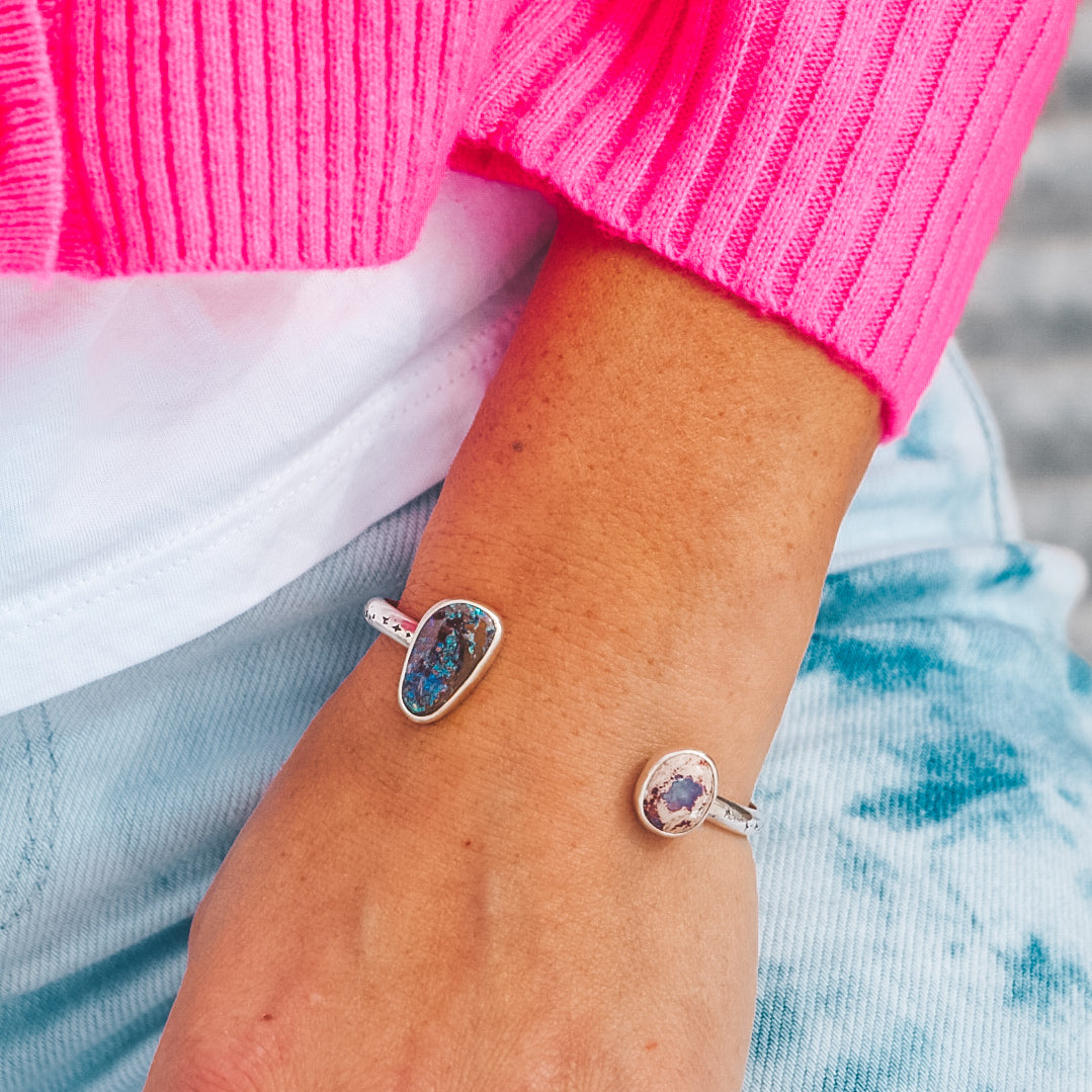This open cuff features two incredible stones: Mexican Opal and Australian Boulder Opal