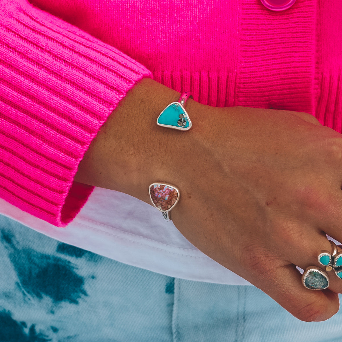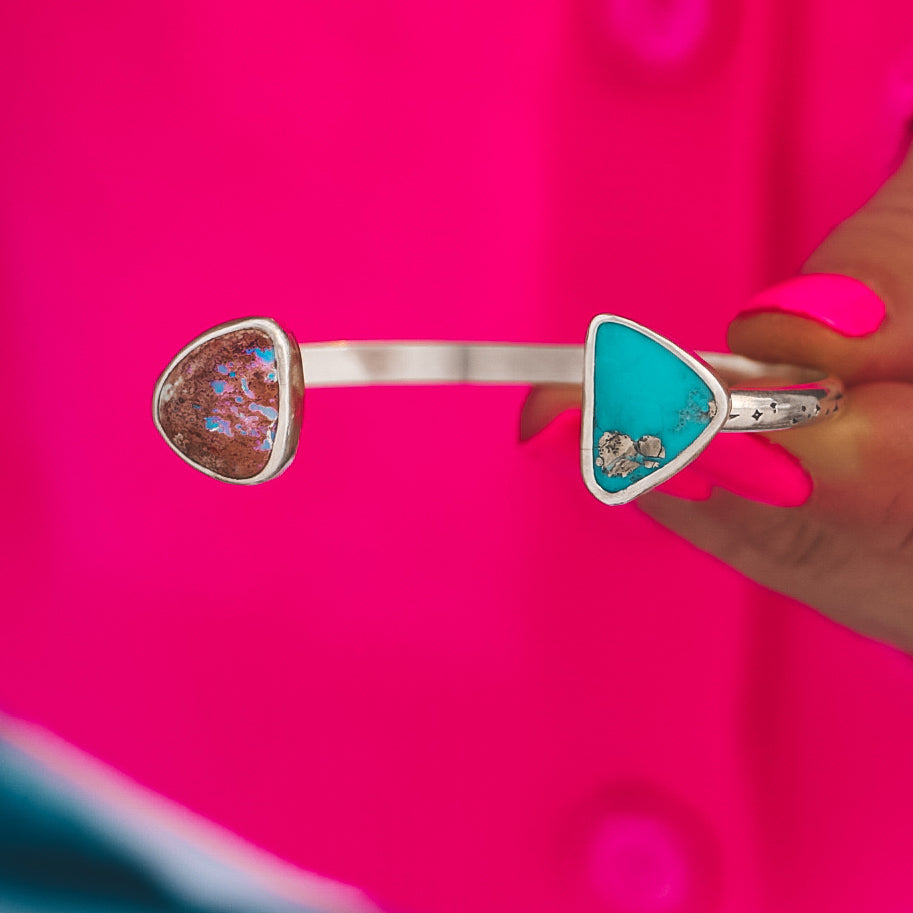 This open cuff features two incredible stones: Mexican Opal and Campitos Turquoise