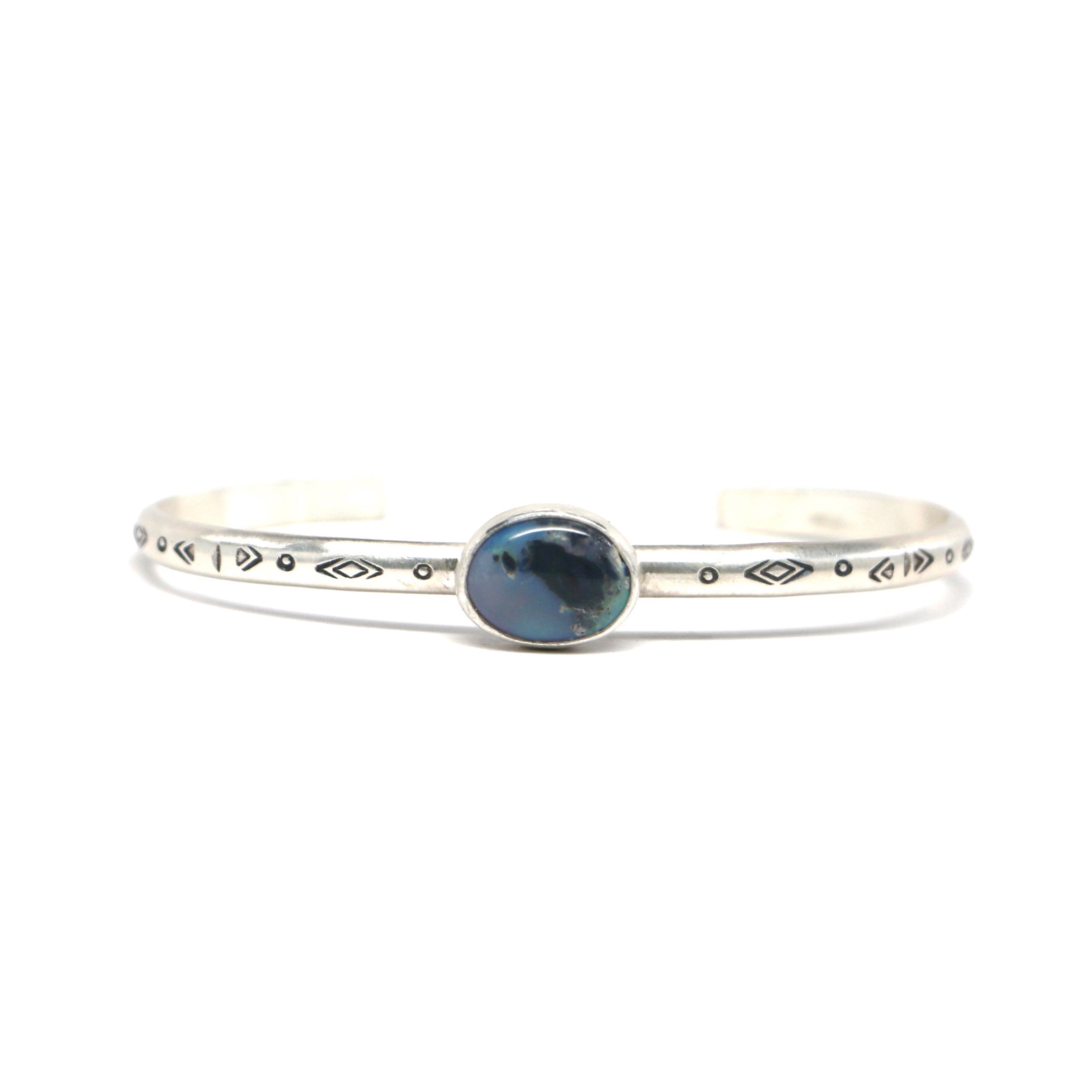 This sterling cuff features an Australian opal and a hand textured band.