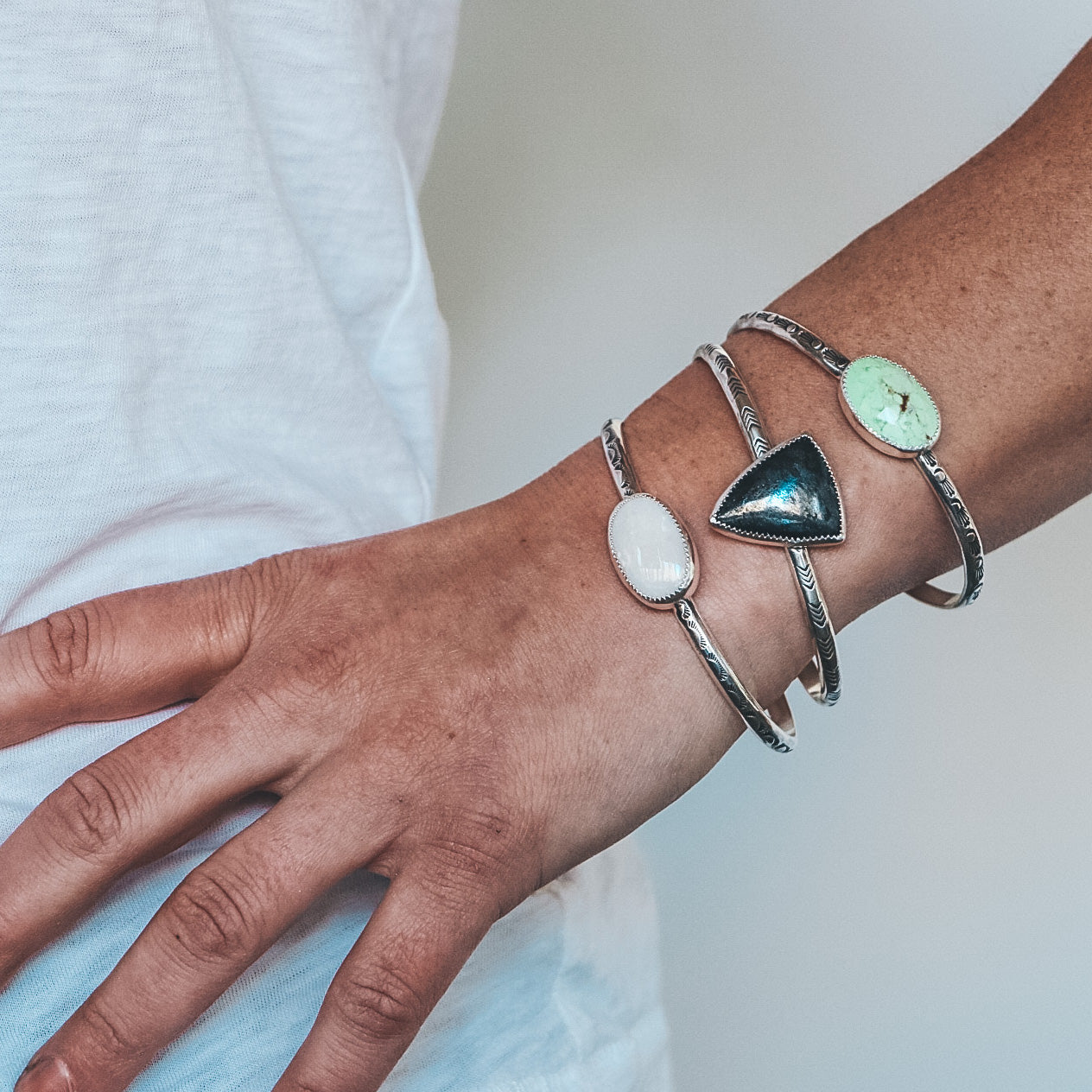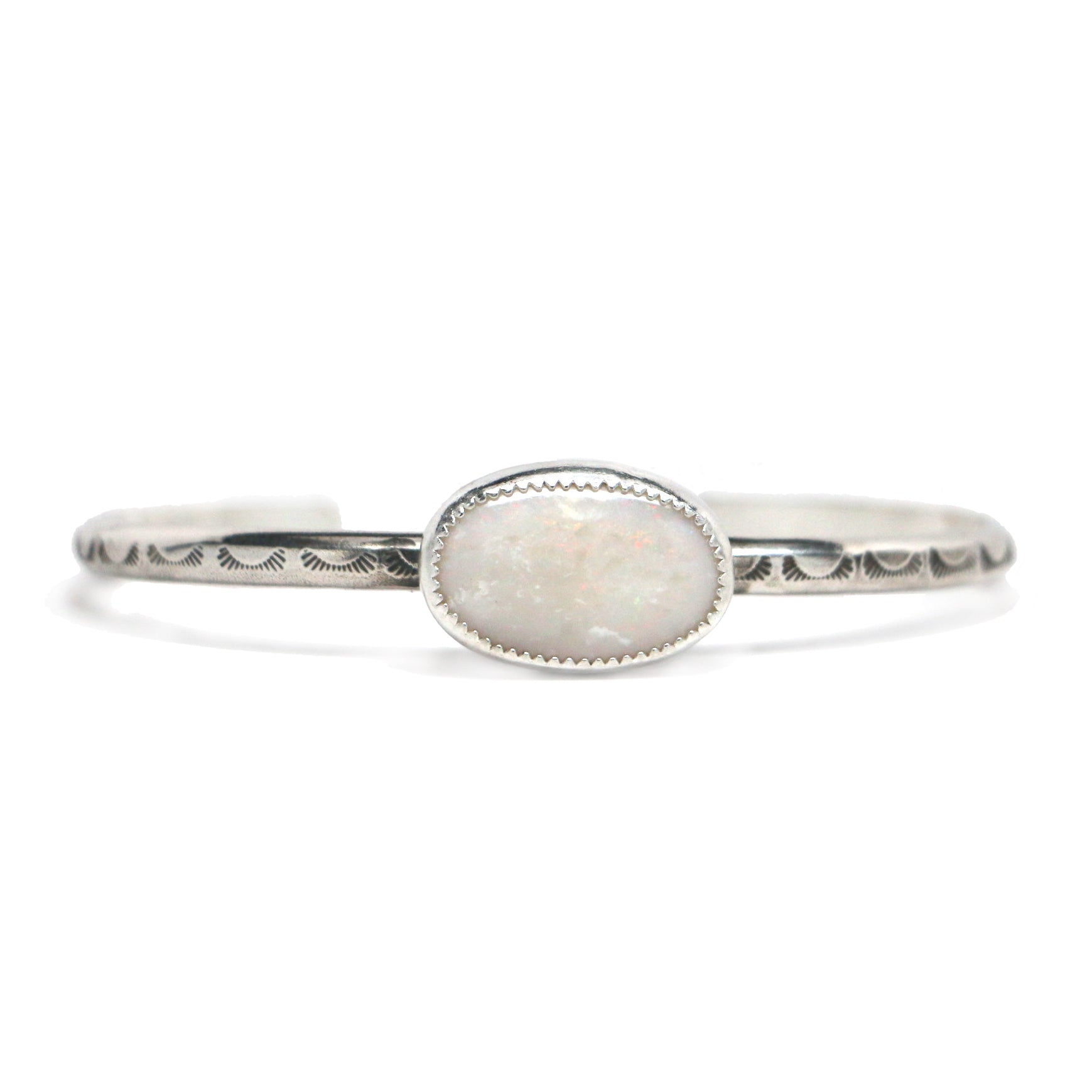 This one-of-a-kind cuff features a glittering white Australian Opal that comes to life in natural sunlight. This cuff is made from sterling silver and fine silver, and features a hand-stamped band. The stone is creamy white in color, with flashes of red and green opal fire.