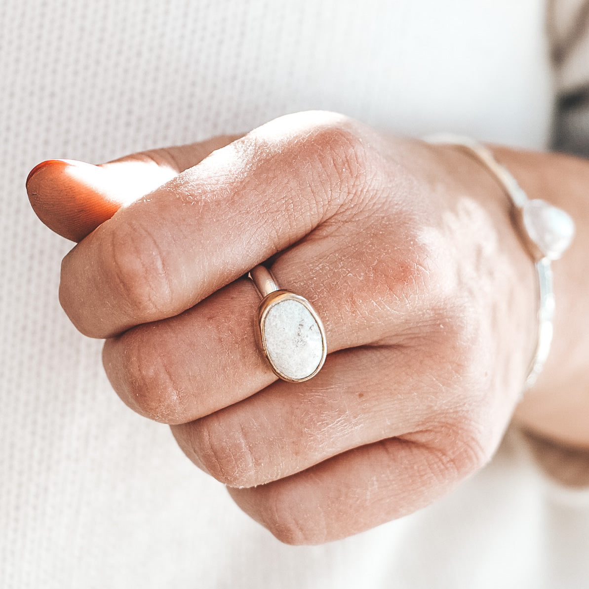 This horizontal Latitude ring features an Australian Opal in white and sandy hues, with flashes of orange and yellow opal fire.
