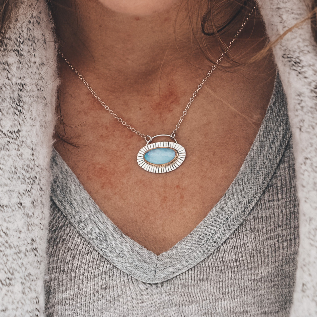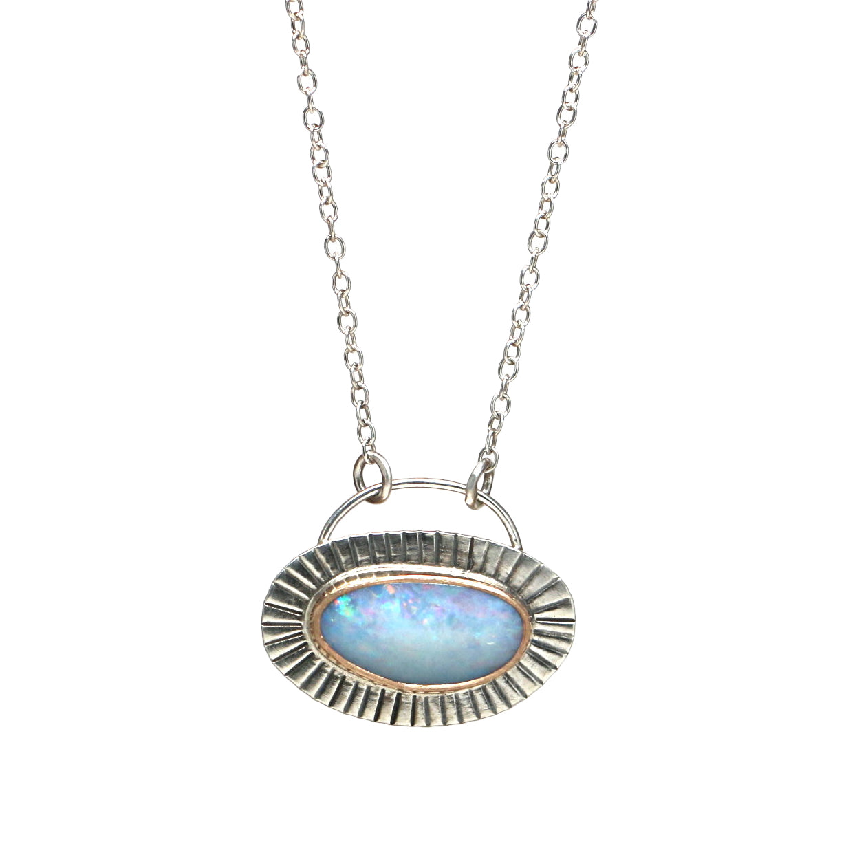 This mixed metal necklace features a glittering Australian blue opal set in a 14k gold filled bezel with a sterling silver backplate. The pendant measures 10mm wide by 17mm tall, including the silver bail.