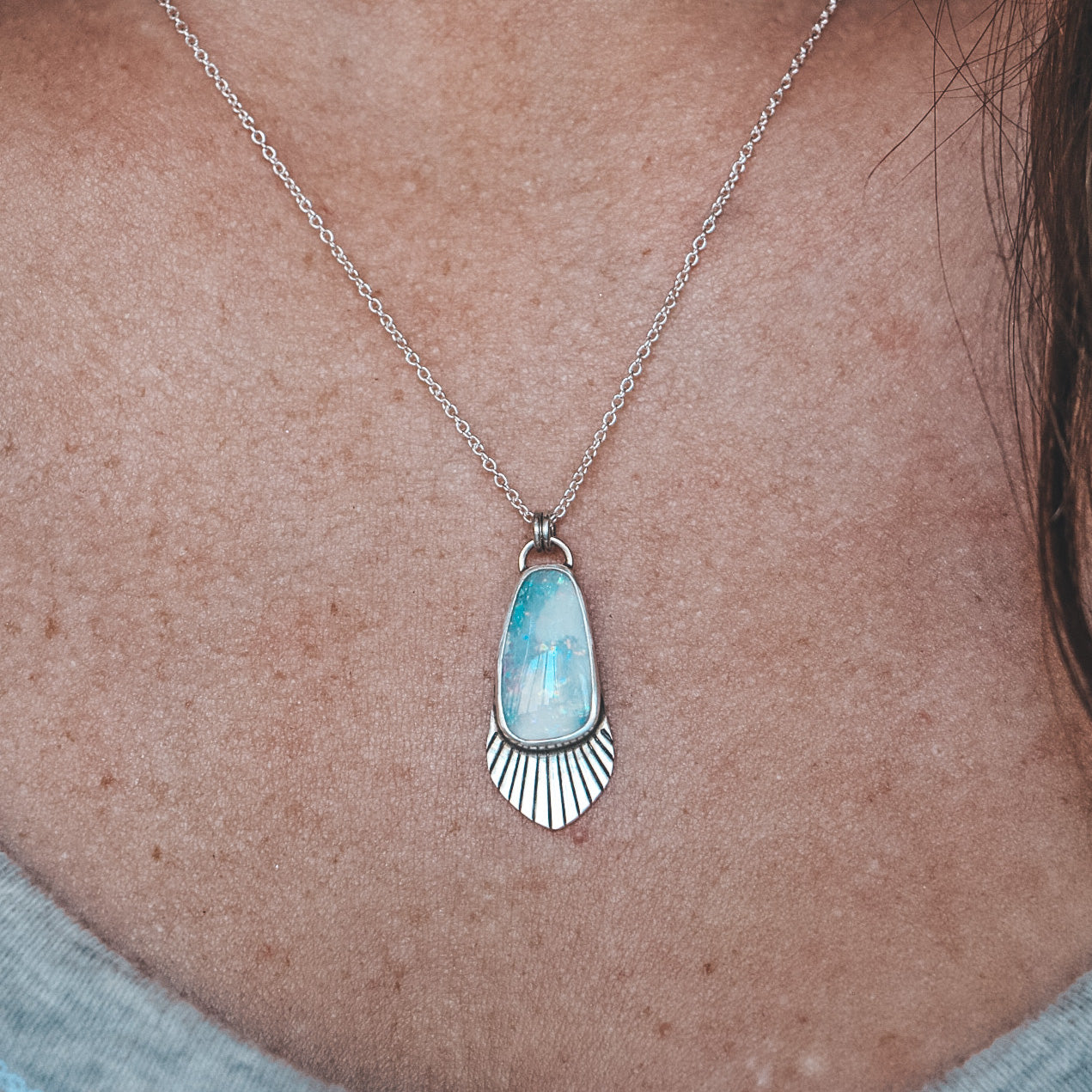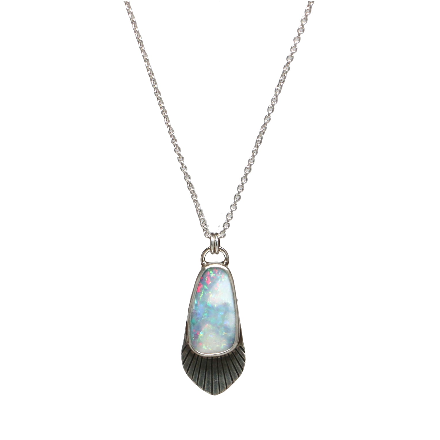 This necklace features an Australian Opal set sterling silver and fine silver. The stone is blue and white in color, with flashes of red, green, and purple opalescence.