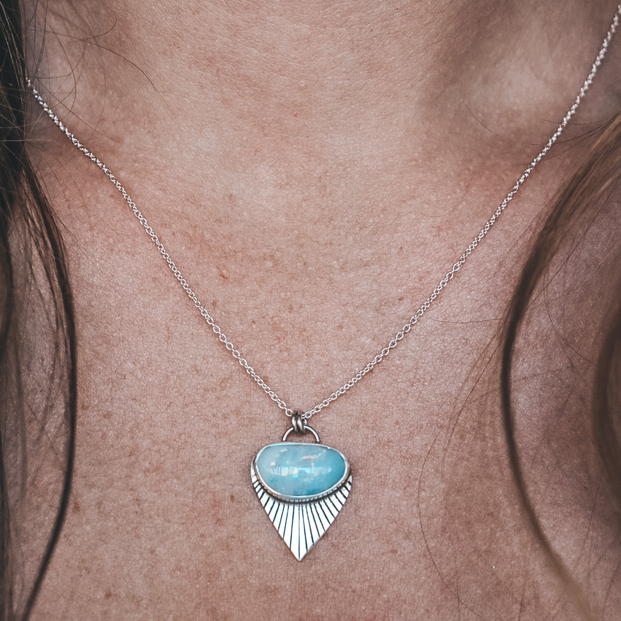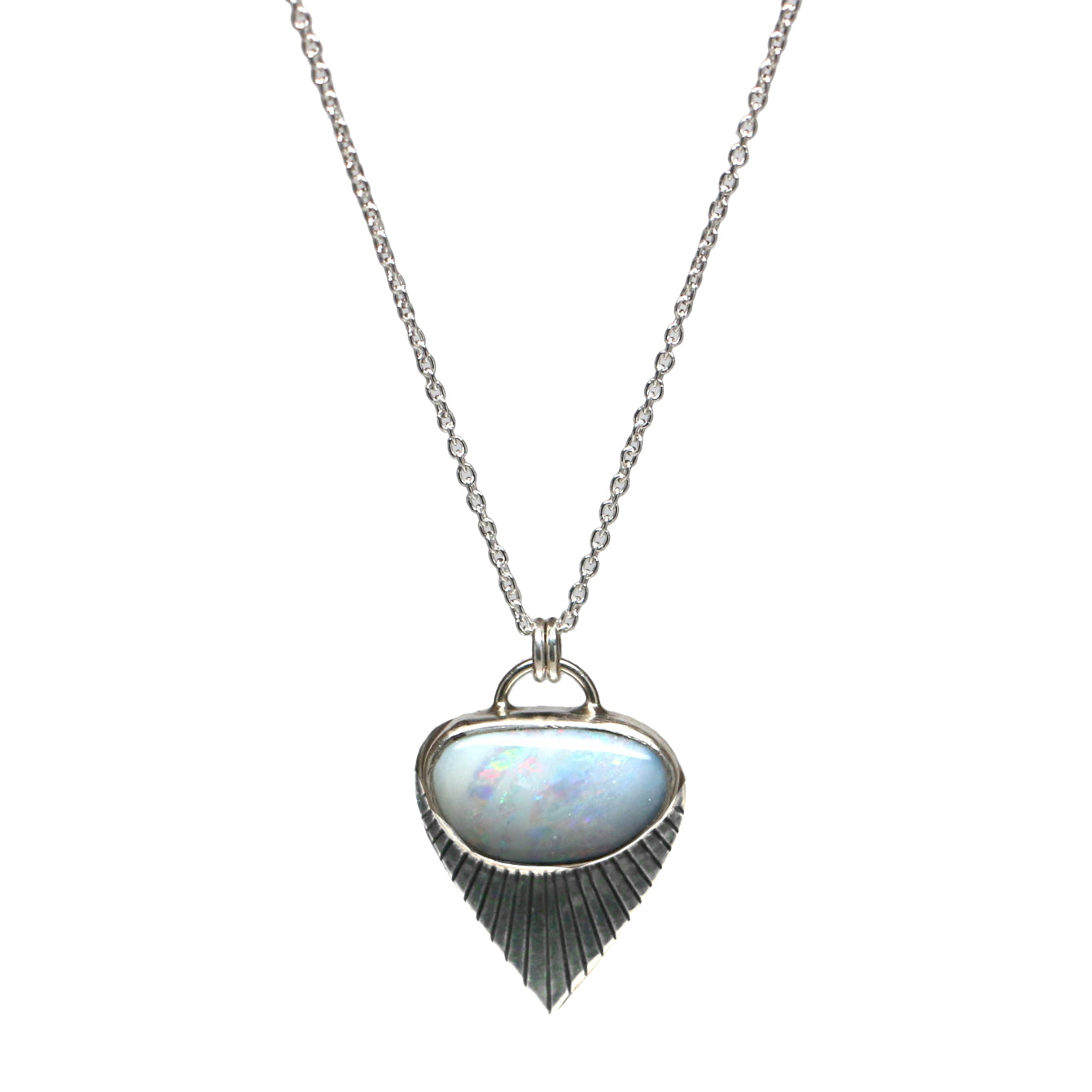 This necklace features an Australian Opal set sterling silver and fine silver. The stone is white and blue in color, with opal flashes of purple and red.