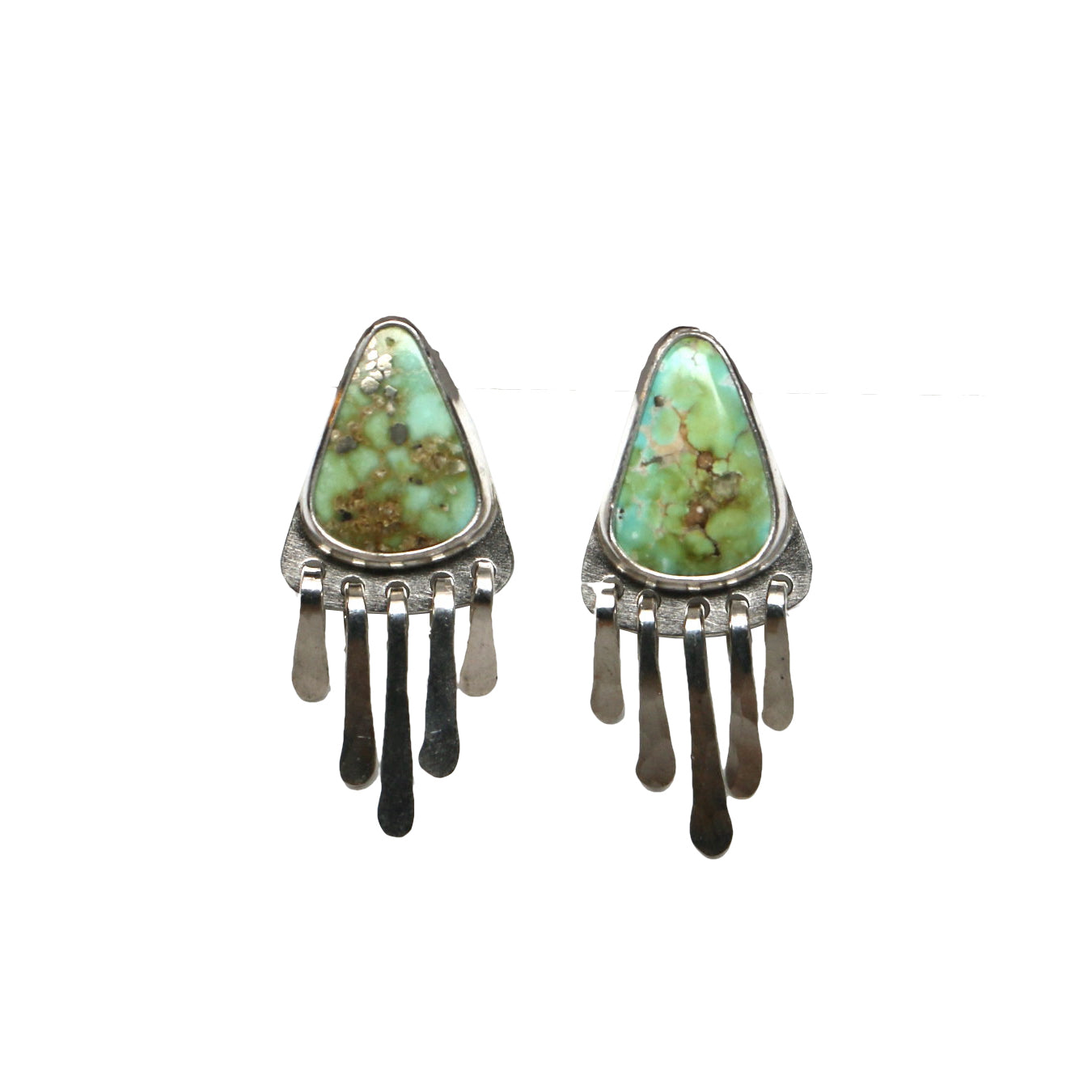 This pair of Baby Fringe Studs features Sonoran Gold Turquoise, mined in Sonora, Mexico. The stones are bright green with variations of teal and lots of pyrite inclusions.
