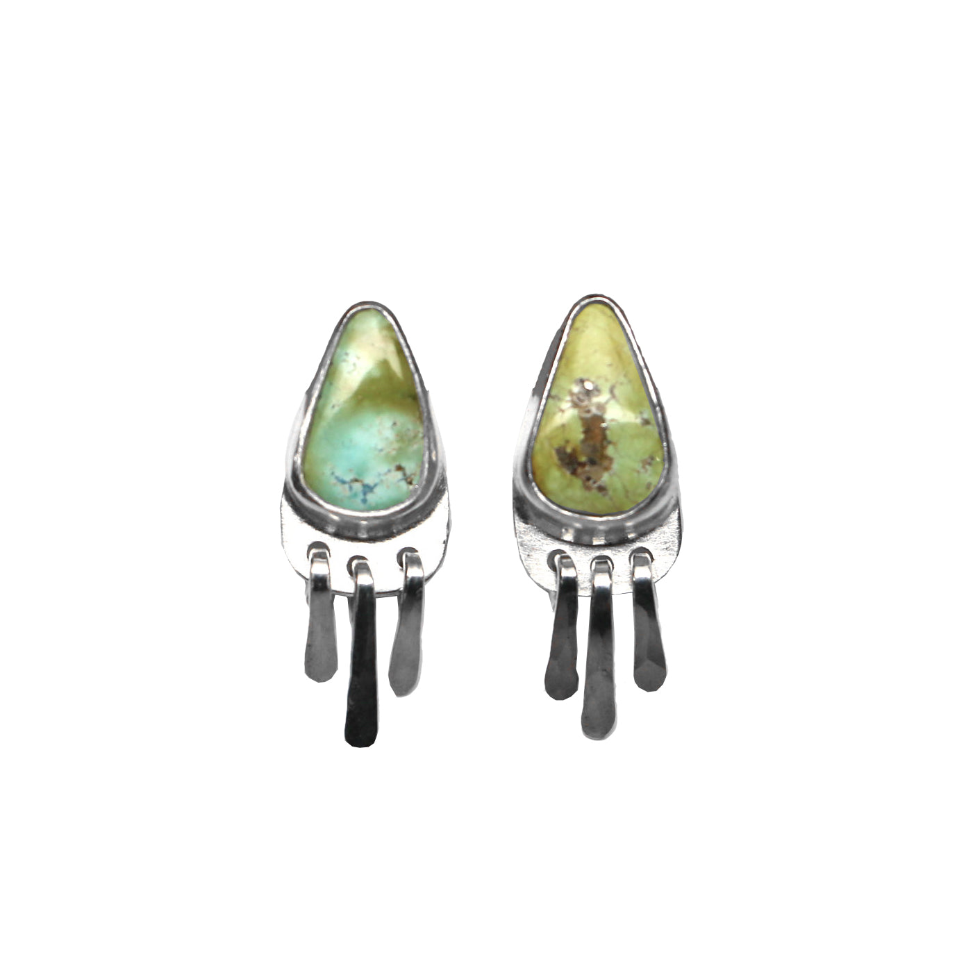 This pair of Baby Fringe Studs features Sonoran Gold Turquoise, which is bright green with flecks of pyrite inclusions and some brown veining.