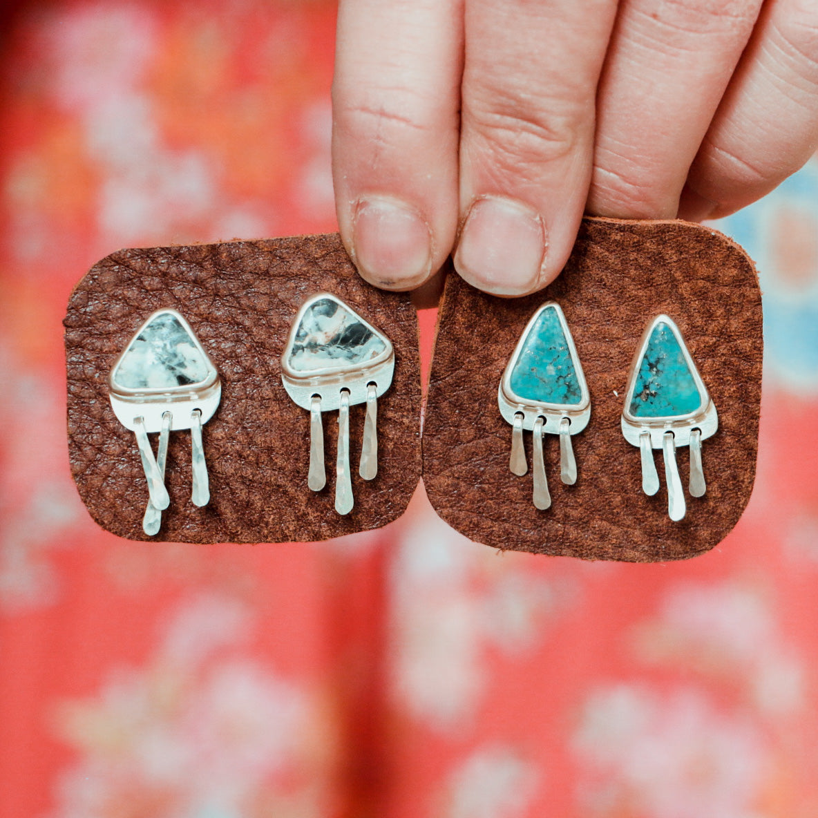 This pair of Baby Fringe Studs features White Buffalo Turquoise, which is a mix of white, grey, and black.