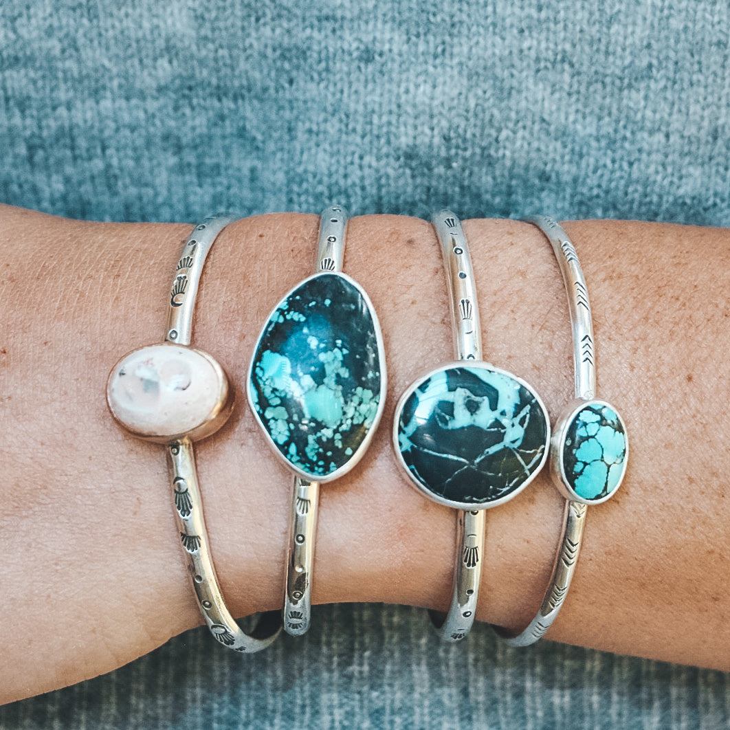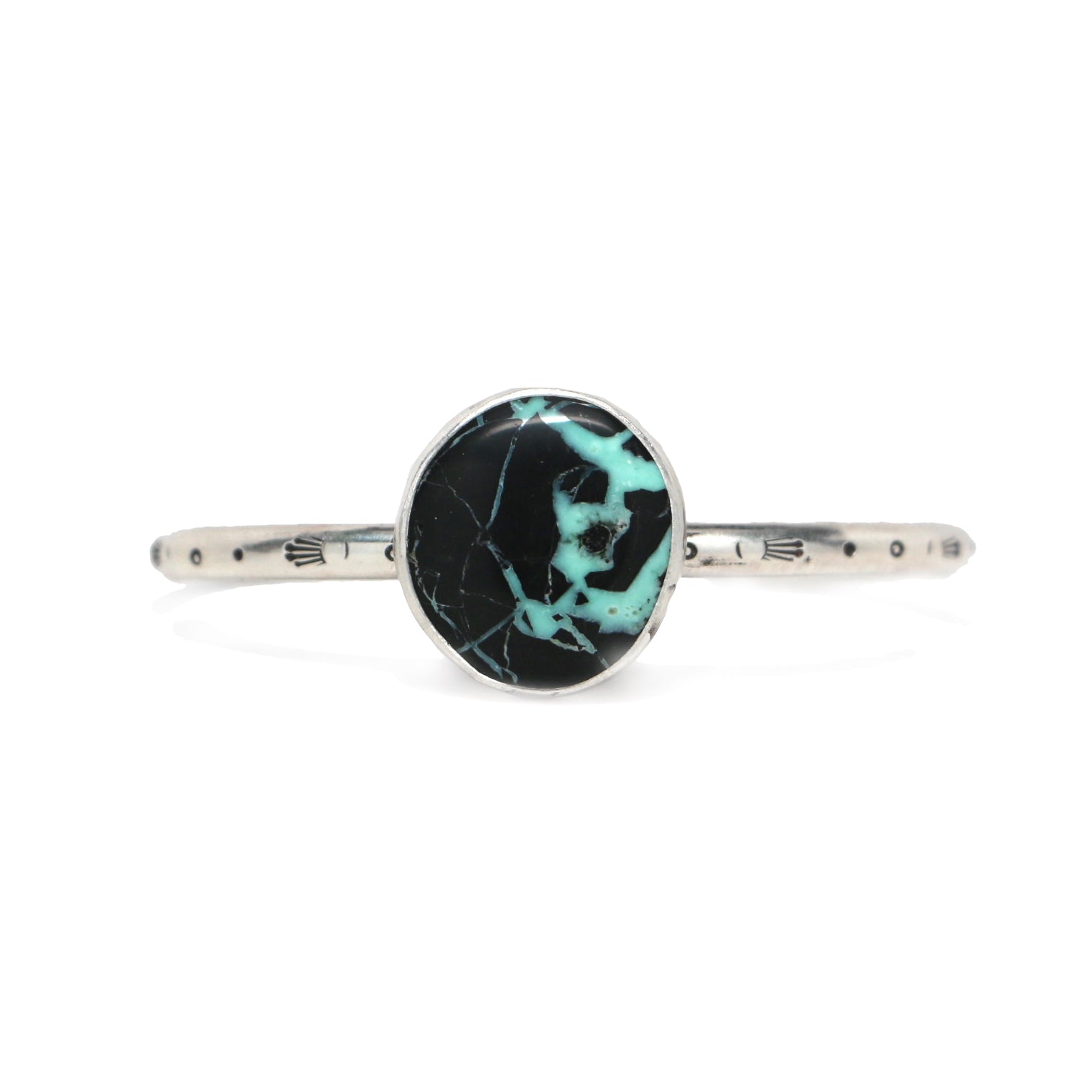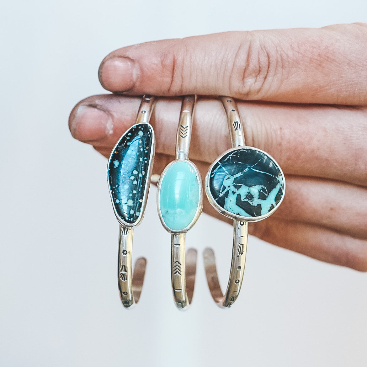 This one-of-a-kind cuff features a Black Buffalo Turquoise, mined in Nevada. This cuff is made from sterling silver and fine silver, and features a hand-stamped band. The centerpiece measures approximately 21mm wide by 22mm tall.
