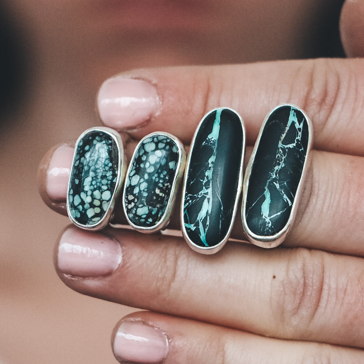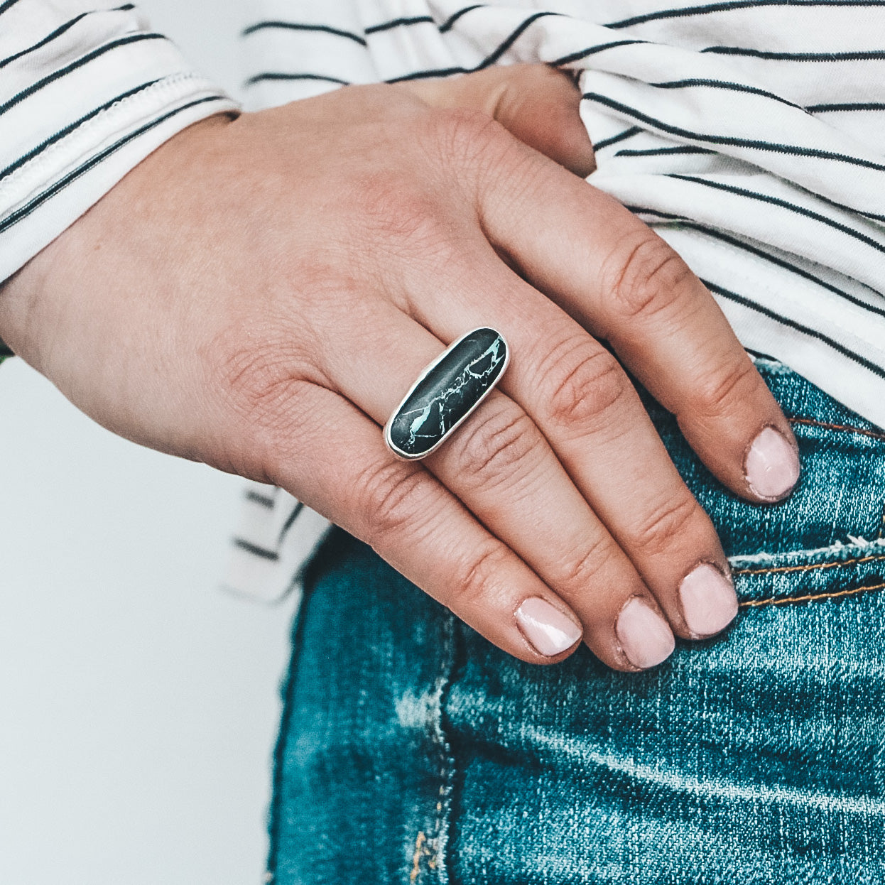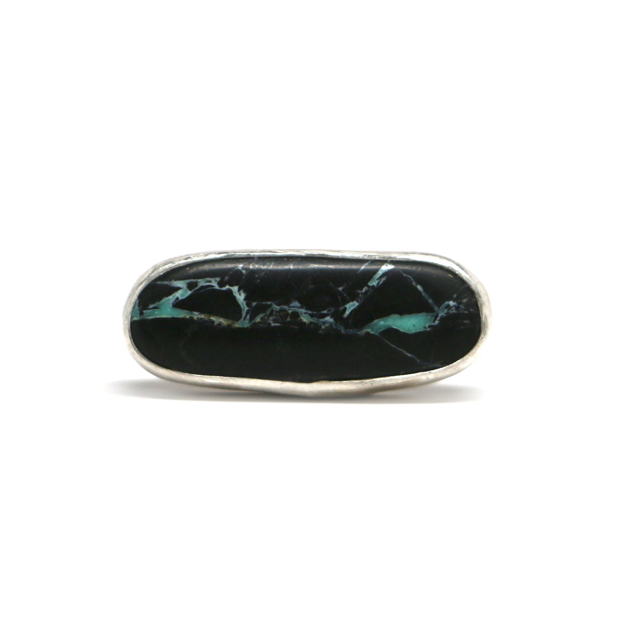 This horizontal Latitude Ring features a Black Buffalo turquoise stone with natural bright green ribbons.