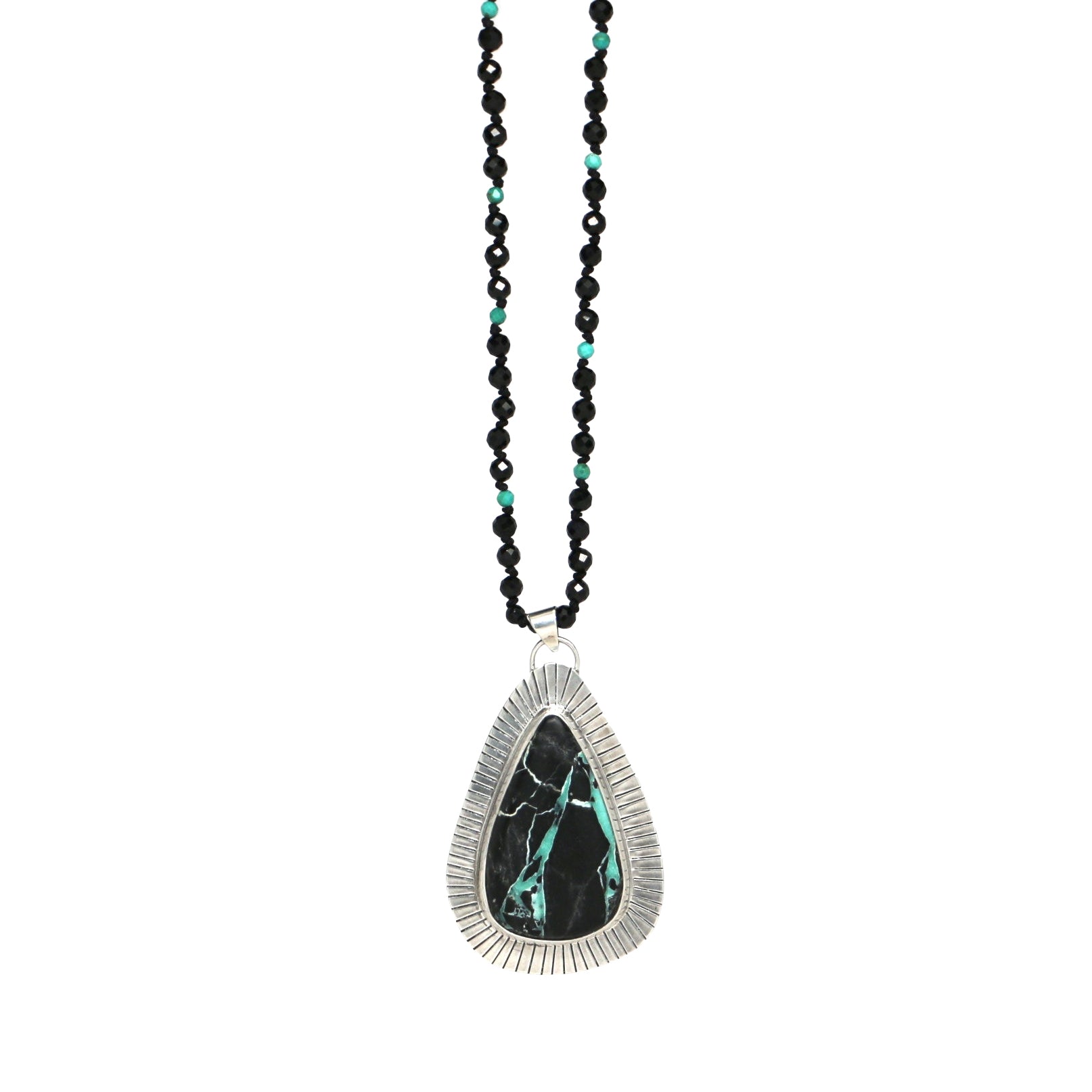 The 2.25" pendant is suspended on a mixed chain, which is part gemstones and part sterling silver. The gemstone portion of the chain consists of black spinel and sleeping beauty turquoise, which are hand-knotted into silk. The piece can be worn doubled by using the included s-hook (see photos), which is a handy removable clasp. The chain measures 33."
