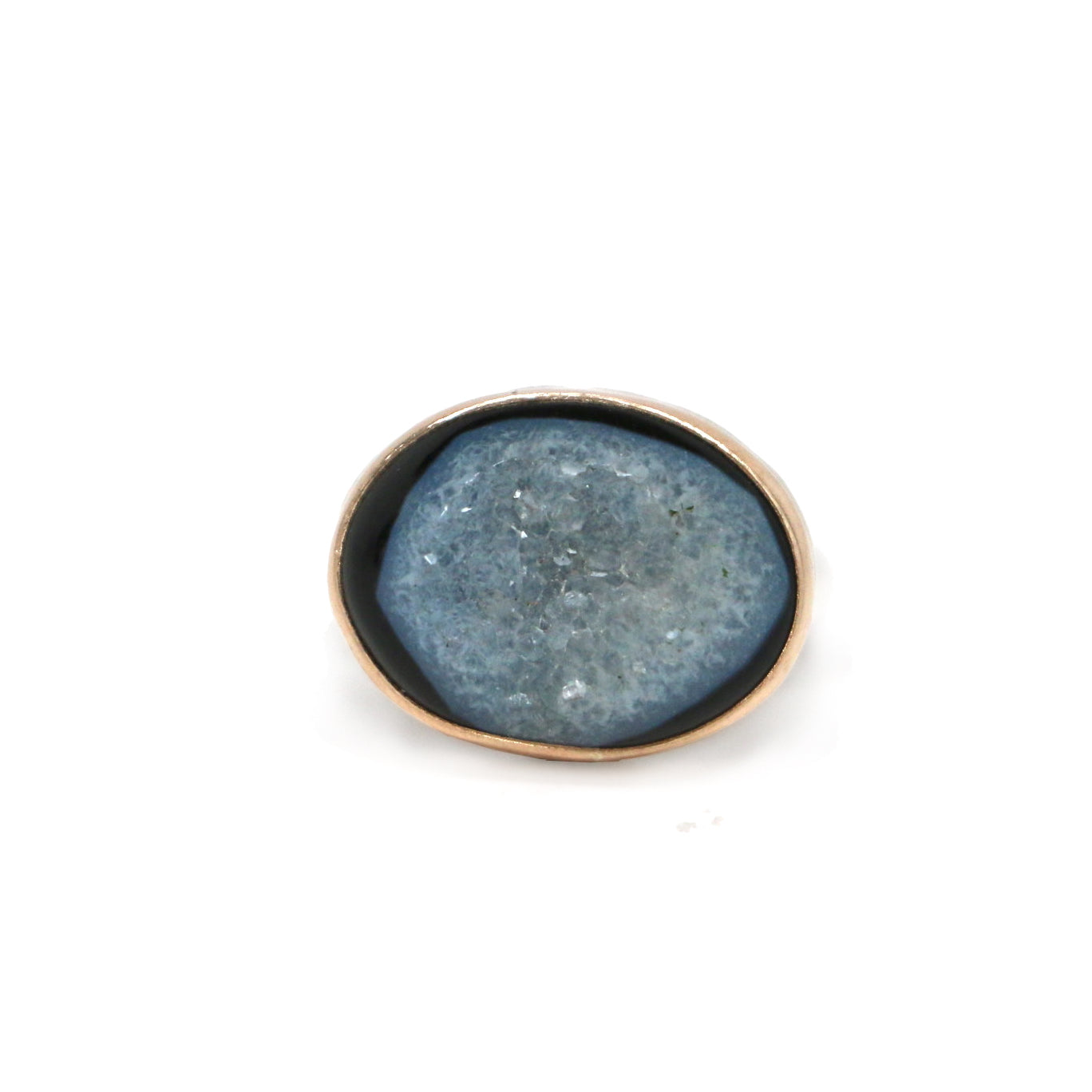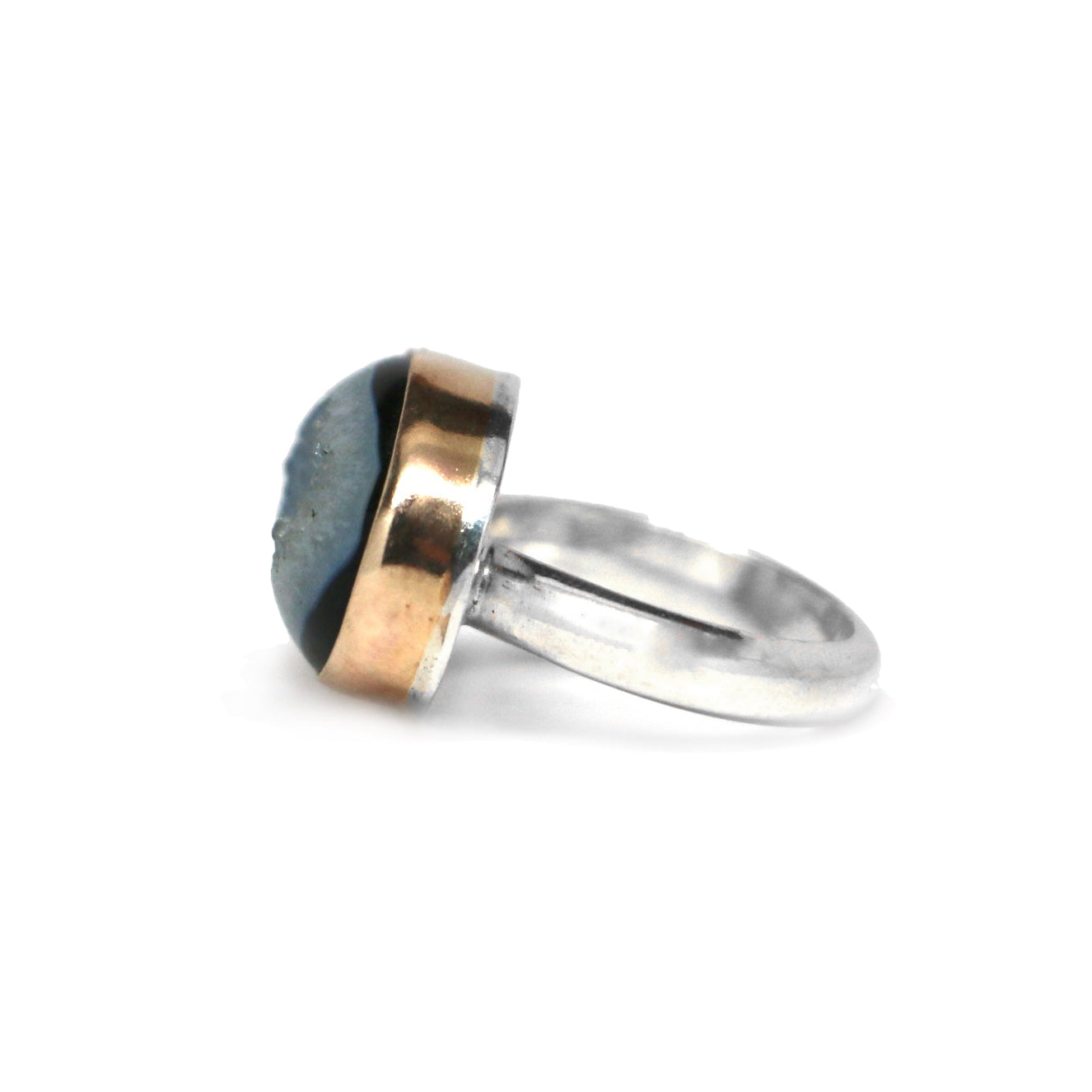 This horizontal Latitude ring features a natural agate druzy, which is black and white with a druzy surface. 'Druzy' describes the texture that forms in a cave when water evaporates off of mineral deposit, leaving a unique crunchy texture on the surface of stones.