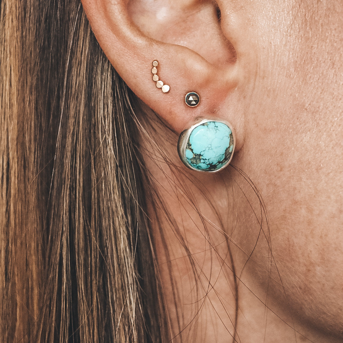 These 'sister' stones are paired for similarity and for their complementary natural look. The stones are hand-chosen and matched, and are completely one of a kind. Blue moon turquoise is light teal-green in color with natural grey veining and tan matrix. The variated patterns in these stones make them, in our opinion, perfectly imperfect.