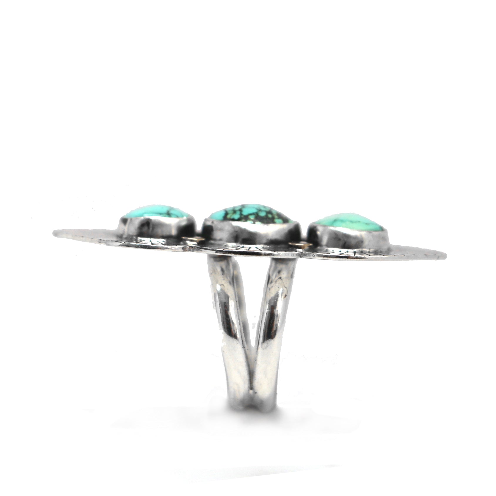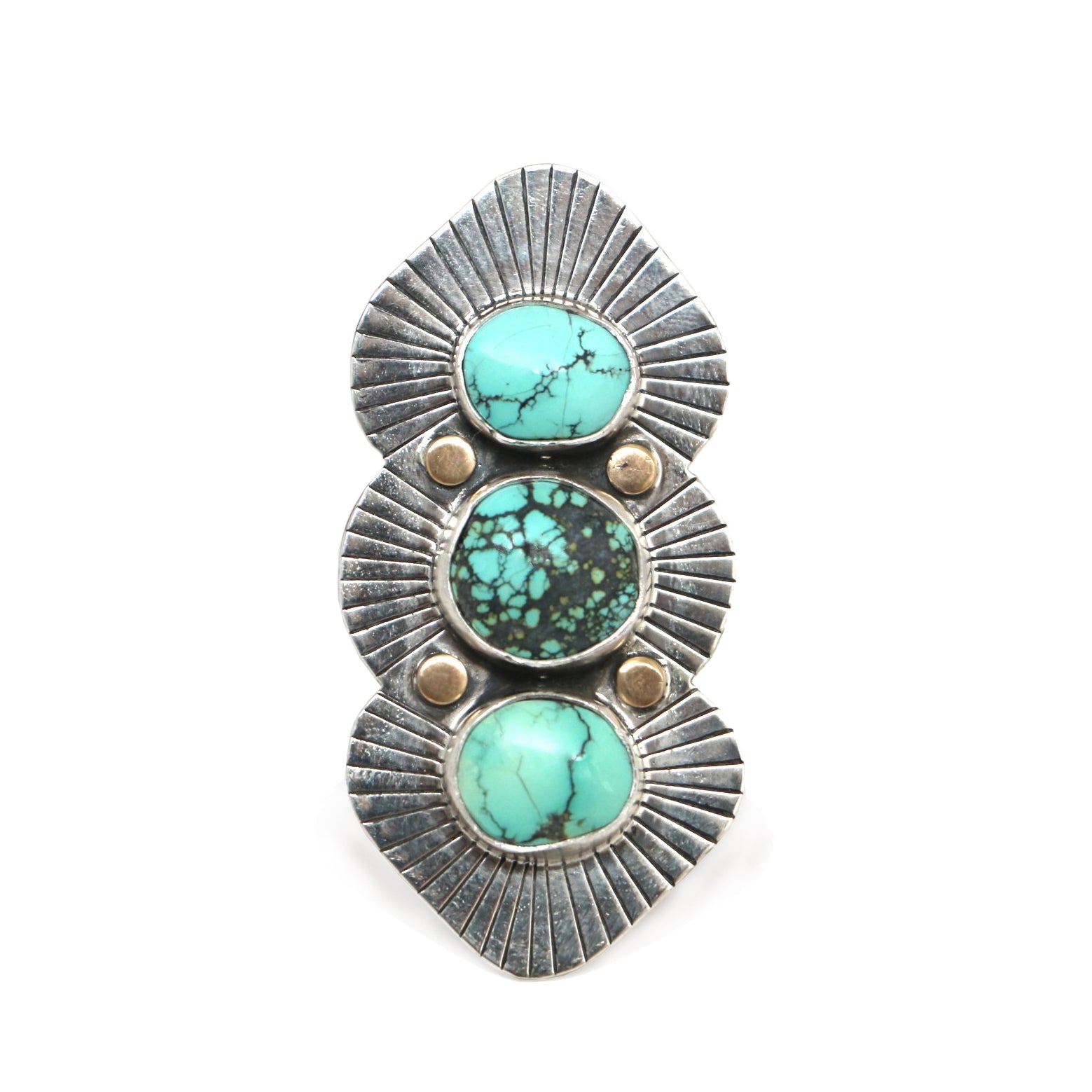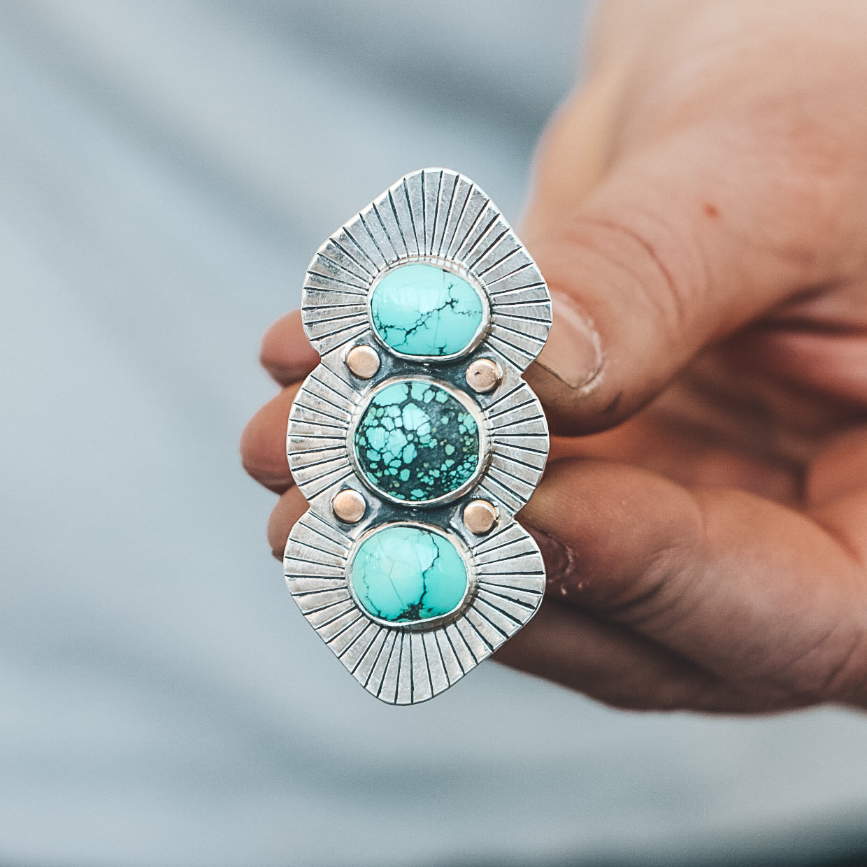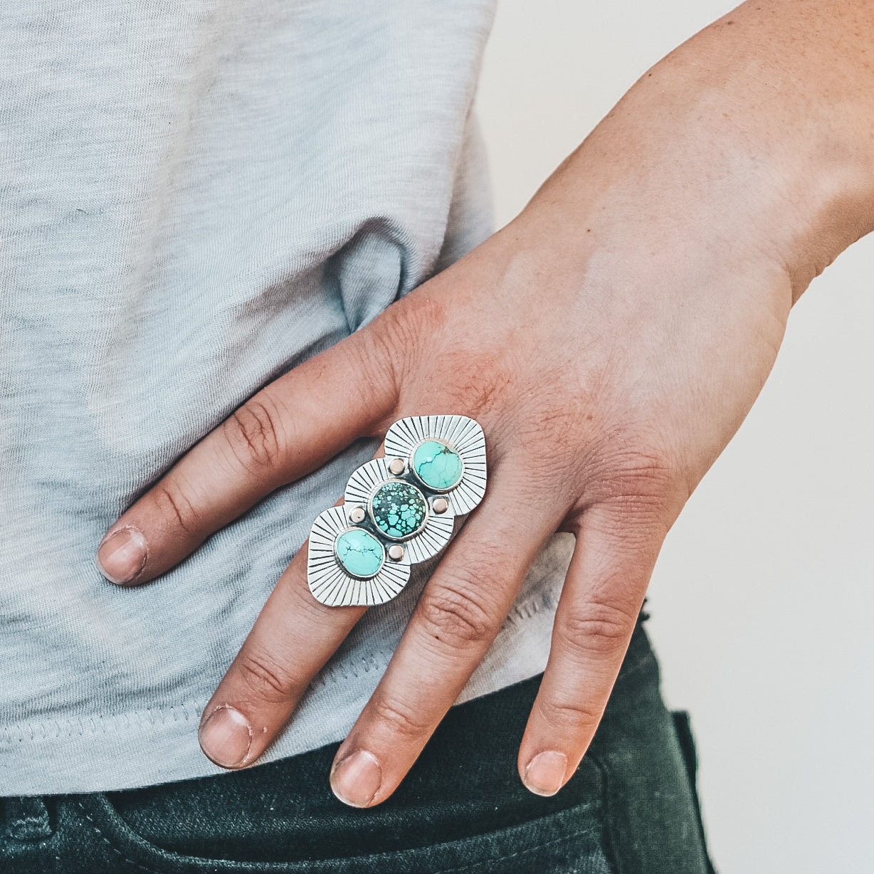 This triple stone ring features three complementary Blue Moon Turquoise stones. The stones are set in fine silver with a hand-stamped sterling silver backplate and brass details.