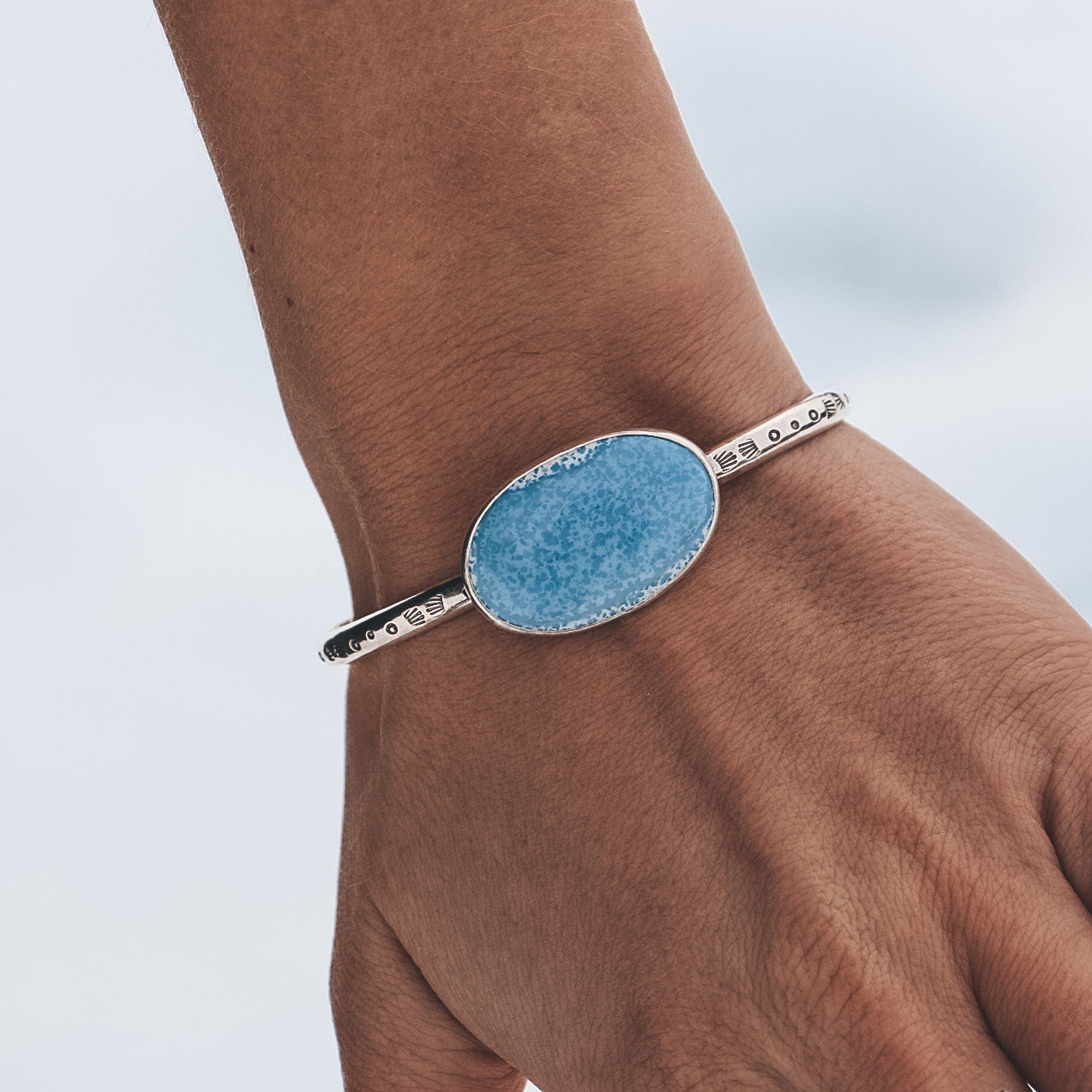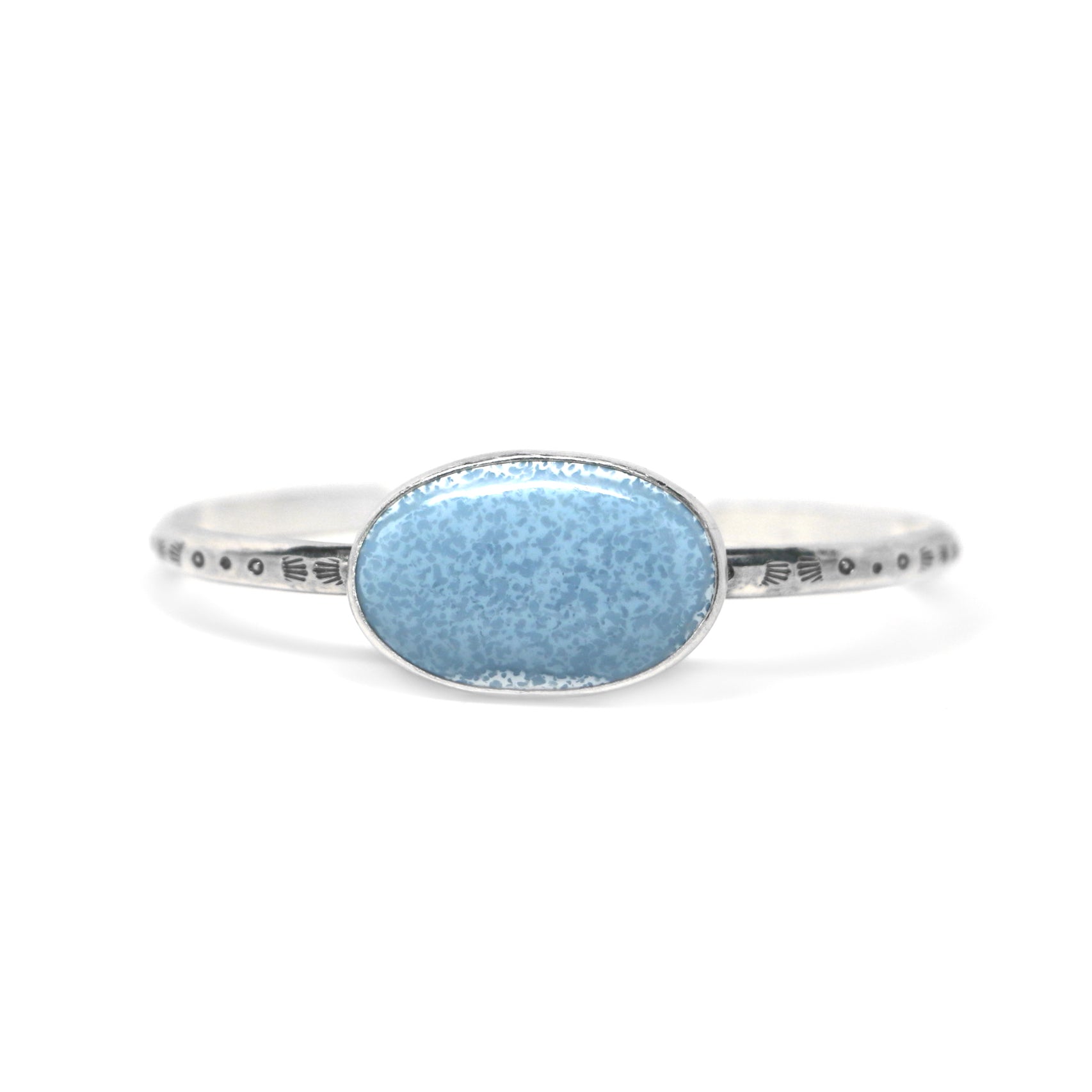 This one-of-a-kind cuff features a light blue opal with dark blue freckles and some white edging. This piece is made from sterling silver and fine silver, and features a hand-stamped band.