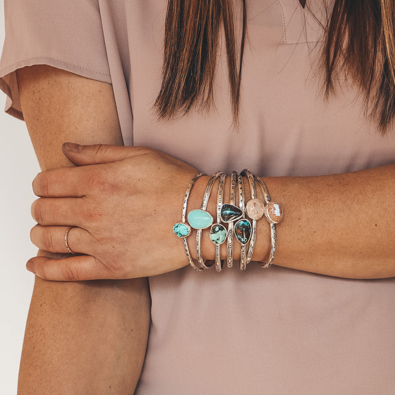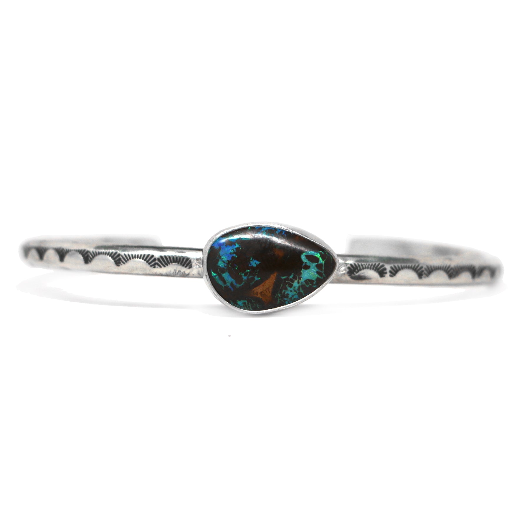 This one-of-a-kind cuff features a Boulder Opal, mined in Australia. The opal has a dark brown matrix with ribbons of blue and green opal fire. This cuff is made from sterling silver and fine silver, and features a hand-stamped band.