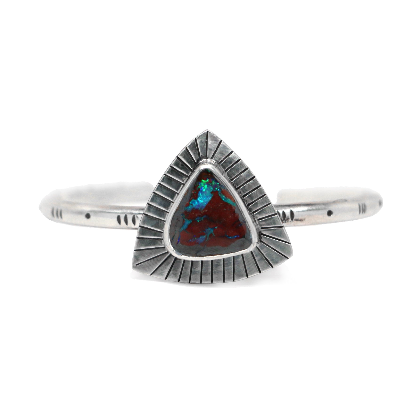 This one-of-a-kind cuff features a Boulder Opal, mined in Australia. This triangular cut opal has a dark brown matrix with ribbons of blue and green opal fire. This cuff is made from sterling silver and fine silver, and features a hand-stamped band and backplate. The centerpiece measures 27mm wide by 27mm tall.