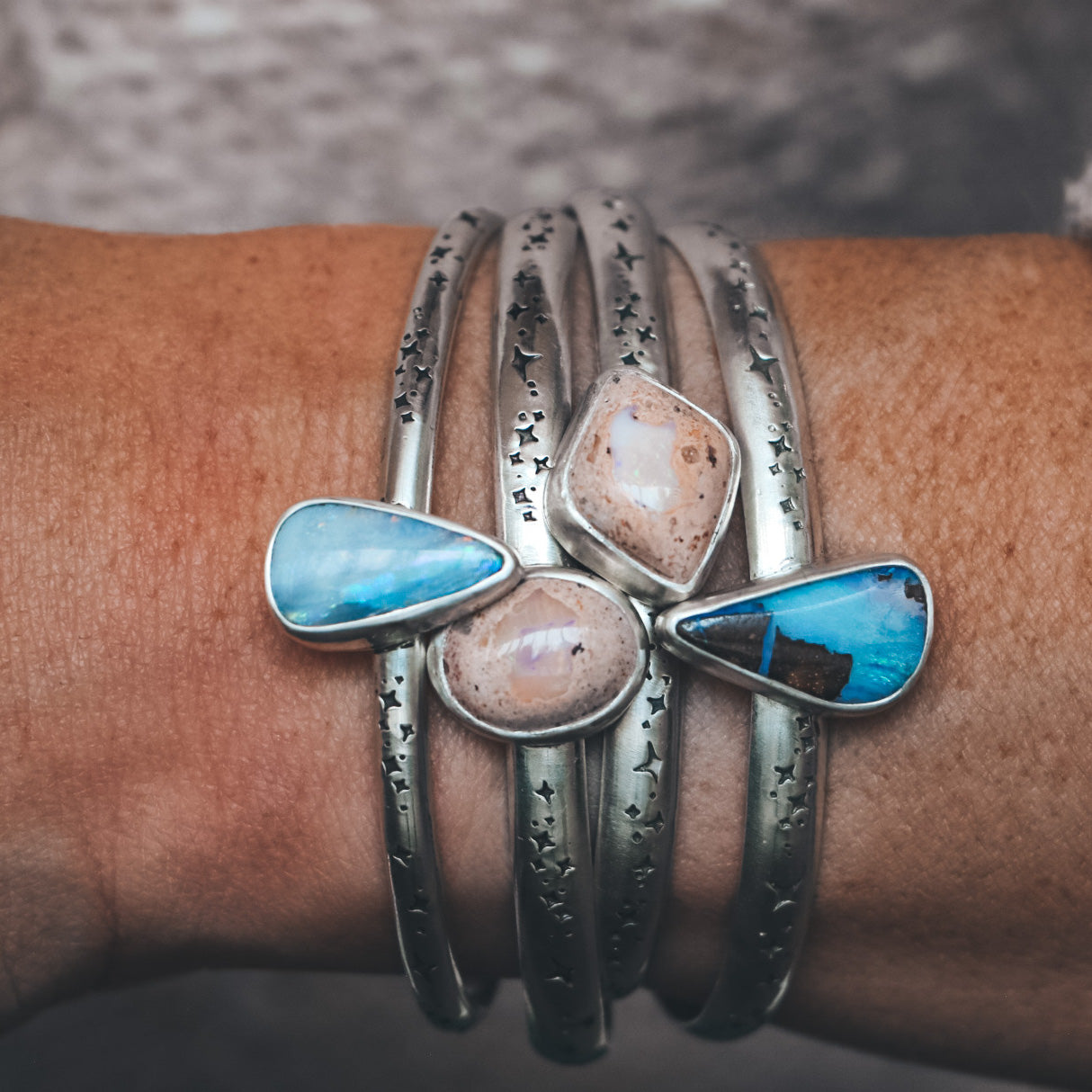 This one-of-a-kind cuff features a glittering Australian Boulder Opal that shows off in natural sunlight. This bracelet is made from sterling silver and fine silver, and features a hand-stamped cuff with a celestial pattern. The triangular stone centerpiece measures 12mm in width and 20mm tall.