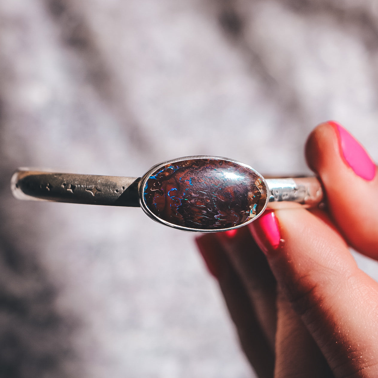 This cuff features a solid Boulder Opal and is completely one of a kind!