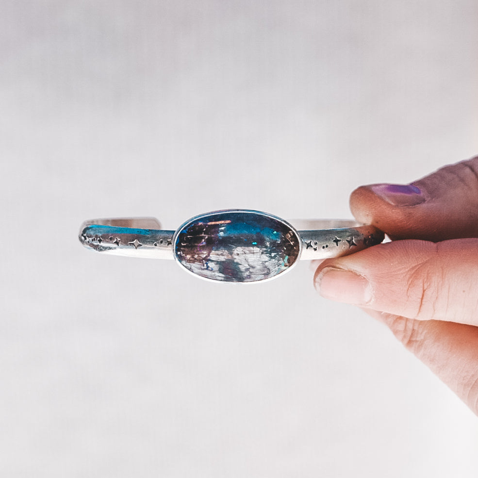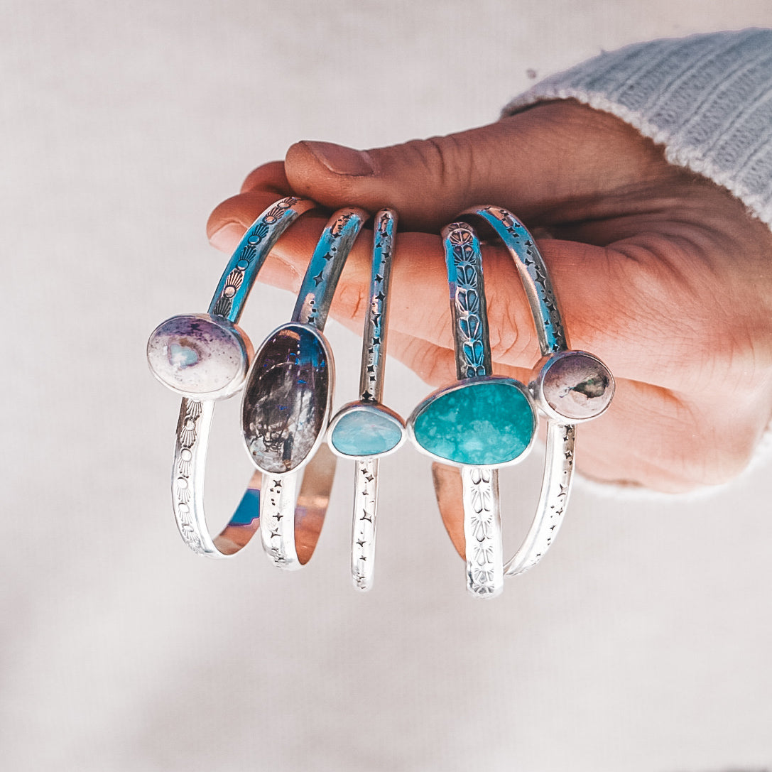 This bracelet is hand crafted by Kate in Aspen, Colorado using semi-precious stones and metals. This cuff is completely one of a kind and you will receive the piece photographed. Cuff will come in a gift box with a travel pouch, polish cloth, and care instructions.