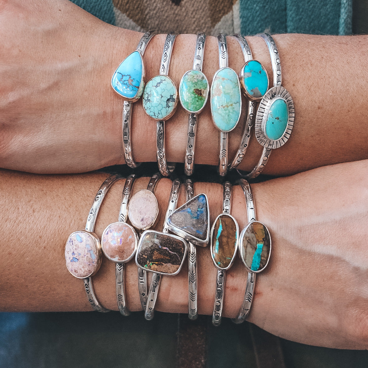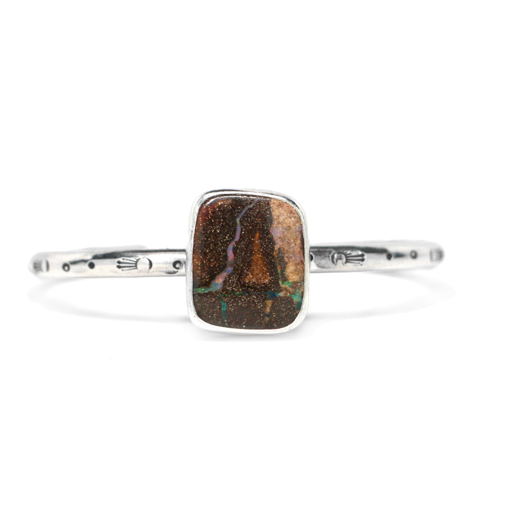 This one-of-a-kind cuff features a Boulder Opal, mined in Australia. This opal is light to dark shades of brown with brilliant rainbow opal fire in pink, green, blue, and purple. This cuff is made from sterling silver and fine silver, and features a hand-stamped band. The stone measures 20mm wide by 14mm tall.