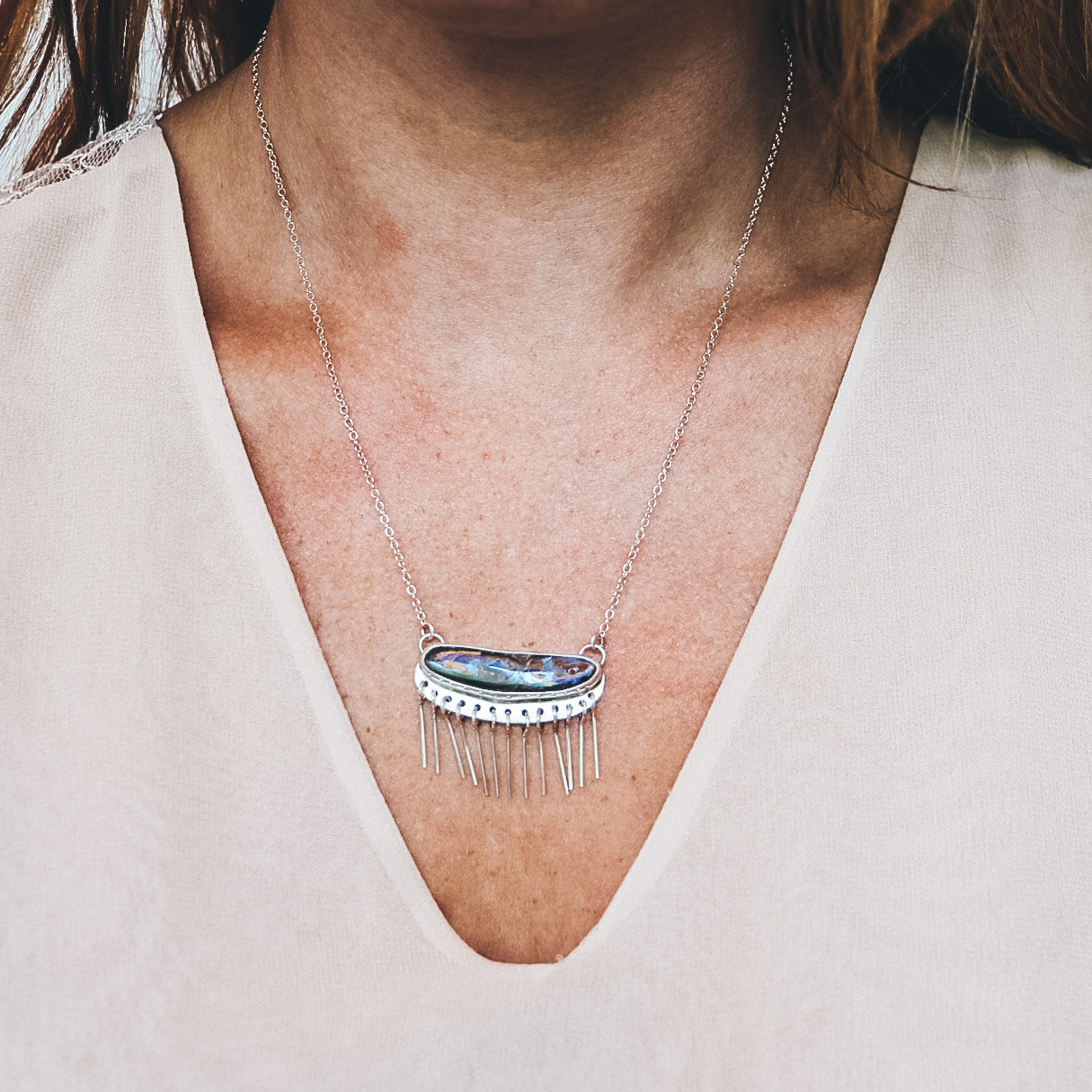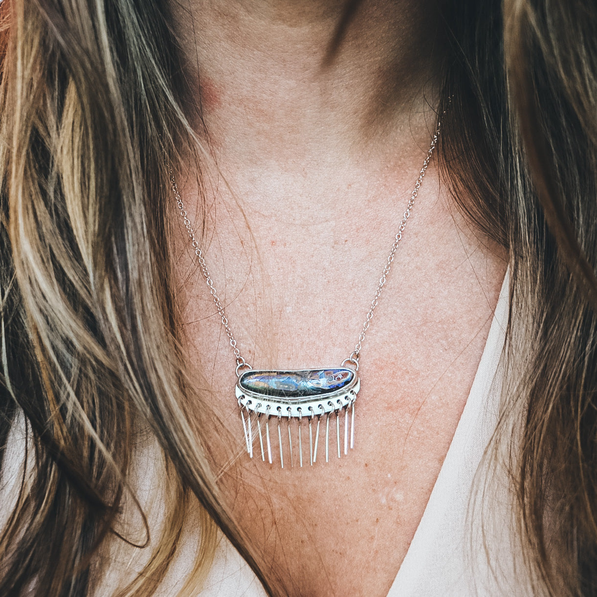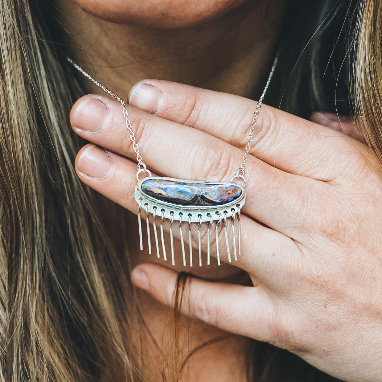 This necklace features a horizontally set Boulder Opal with handmade fringe detail. The stone is dark brown in color with light tan variation and pockets of opal fire. The necklace is made from sterling silver and fine silver, and measures 36mm wide by 30mm tall. This necklace is modeled on an 18" inch chain.