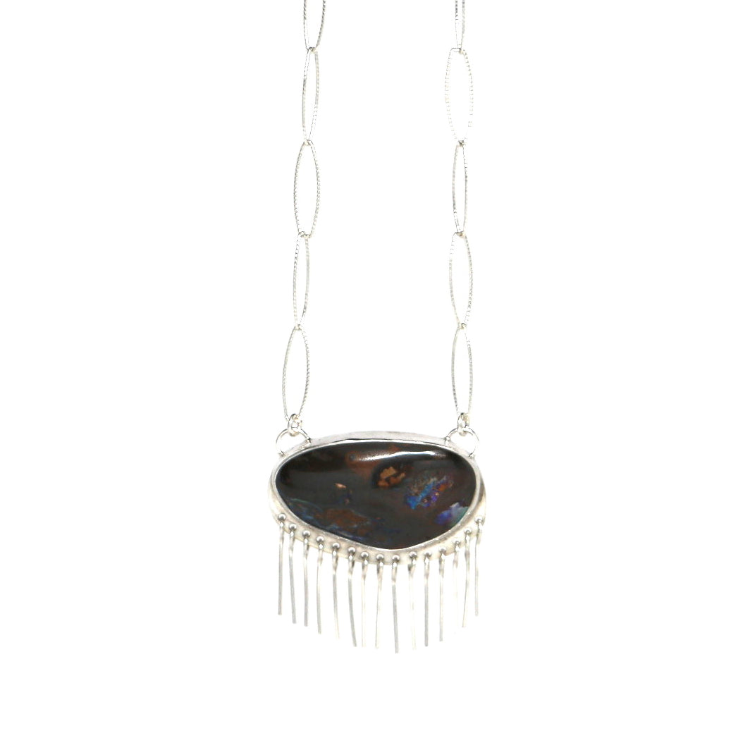 This necklace features a horizontally set Boulder Opal with handmade fringe detail. The stone is deep brown in color with an irregular surface and pockets of opal fire. The pendant is made from sterling silver and fine silver, and measures 40mm wide by 40mm tall.