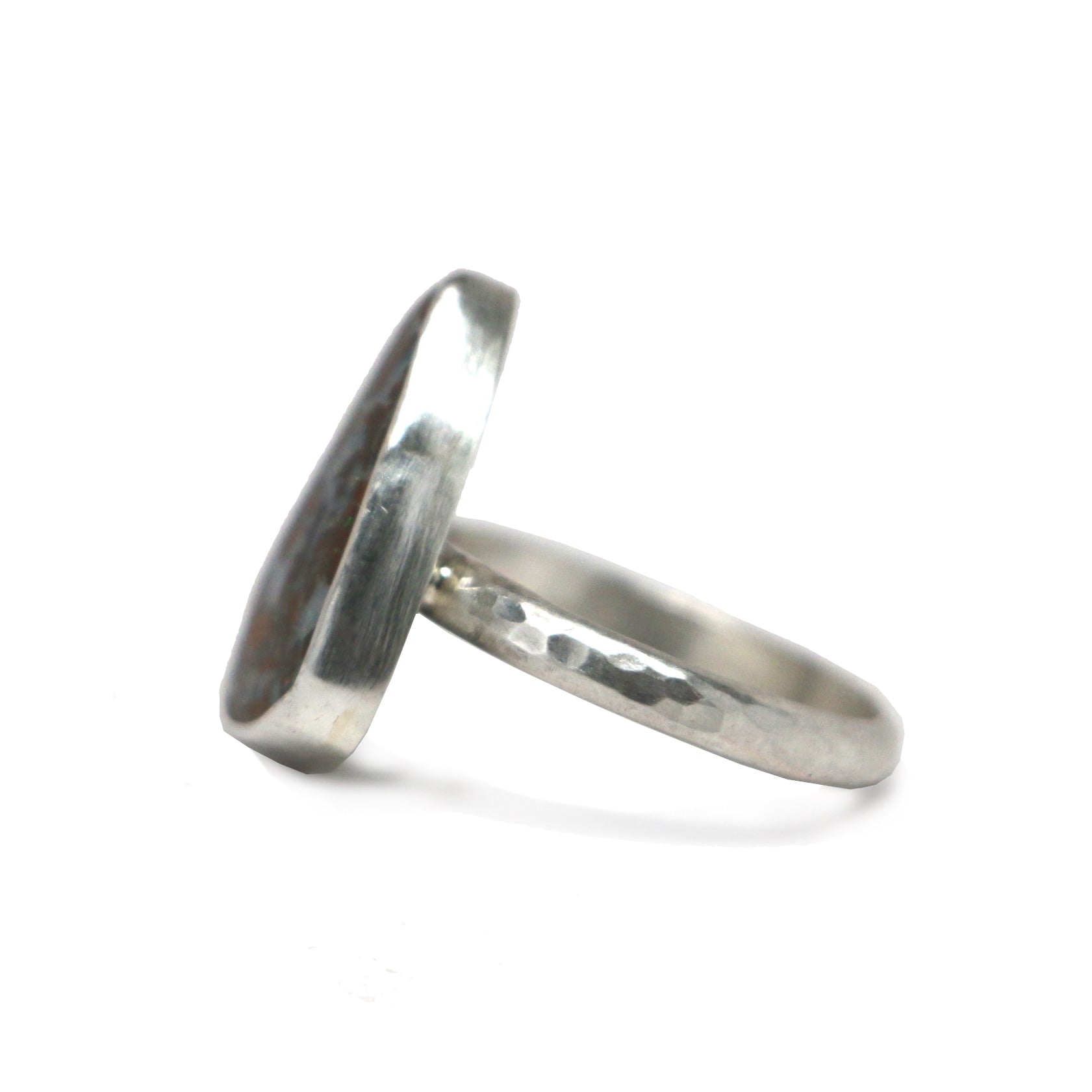 This one of a kind opal has rivers of purple iridescence with splashes of magenta fire. The stone is set in sterling silver with a hammered band. The stone measures 3/4" tall by 1/2" wide.