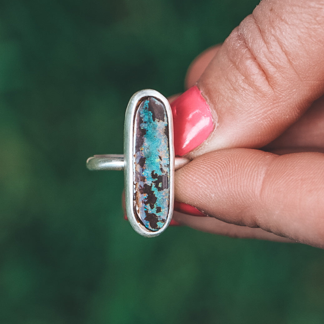 This one of a kind opal has rivers of purple, green, and blue iridescence. The stone is set in sterling silver with a smooth band. The stone measures 1" tall by 1/4" wide.