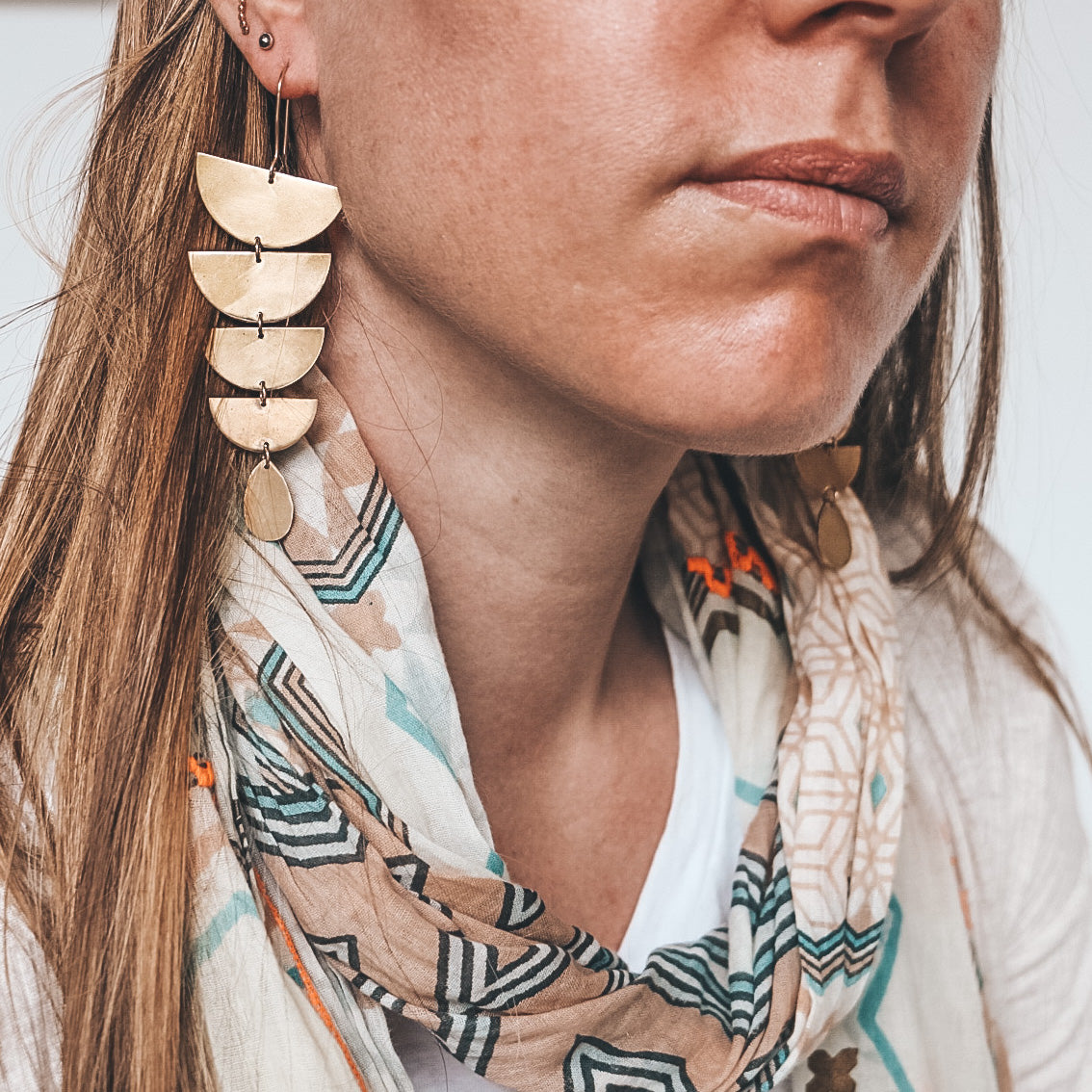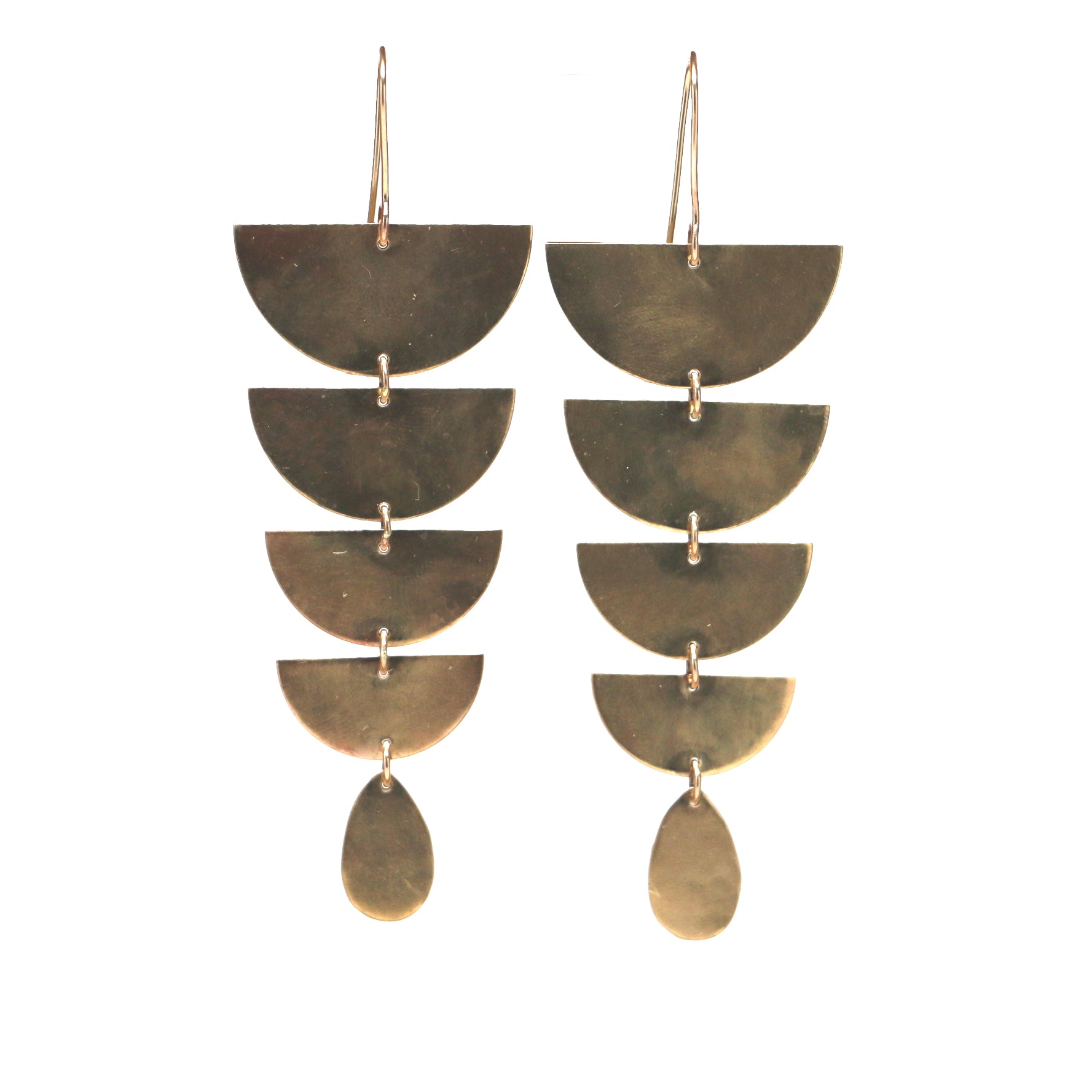 These earrings are crafted from brass (the shapes) and 14k gold fill (the rings and earwire) and have a matte polish finish. Earrings measure 3.75" in length and are pleasingly lightweight for their size.