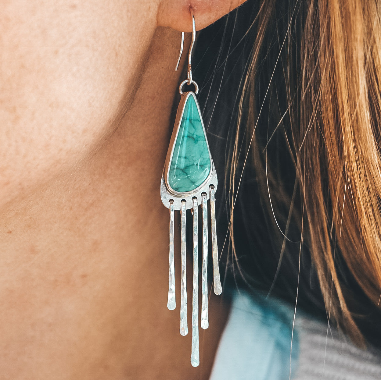 These gorgeous Broken Arrow Variscite fringe earrings have incredible movement and are completely one of a kind!