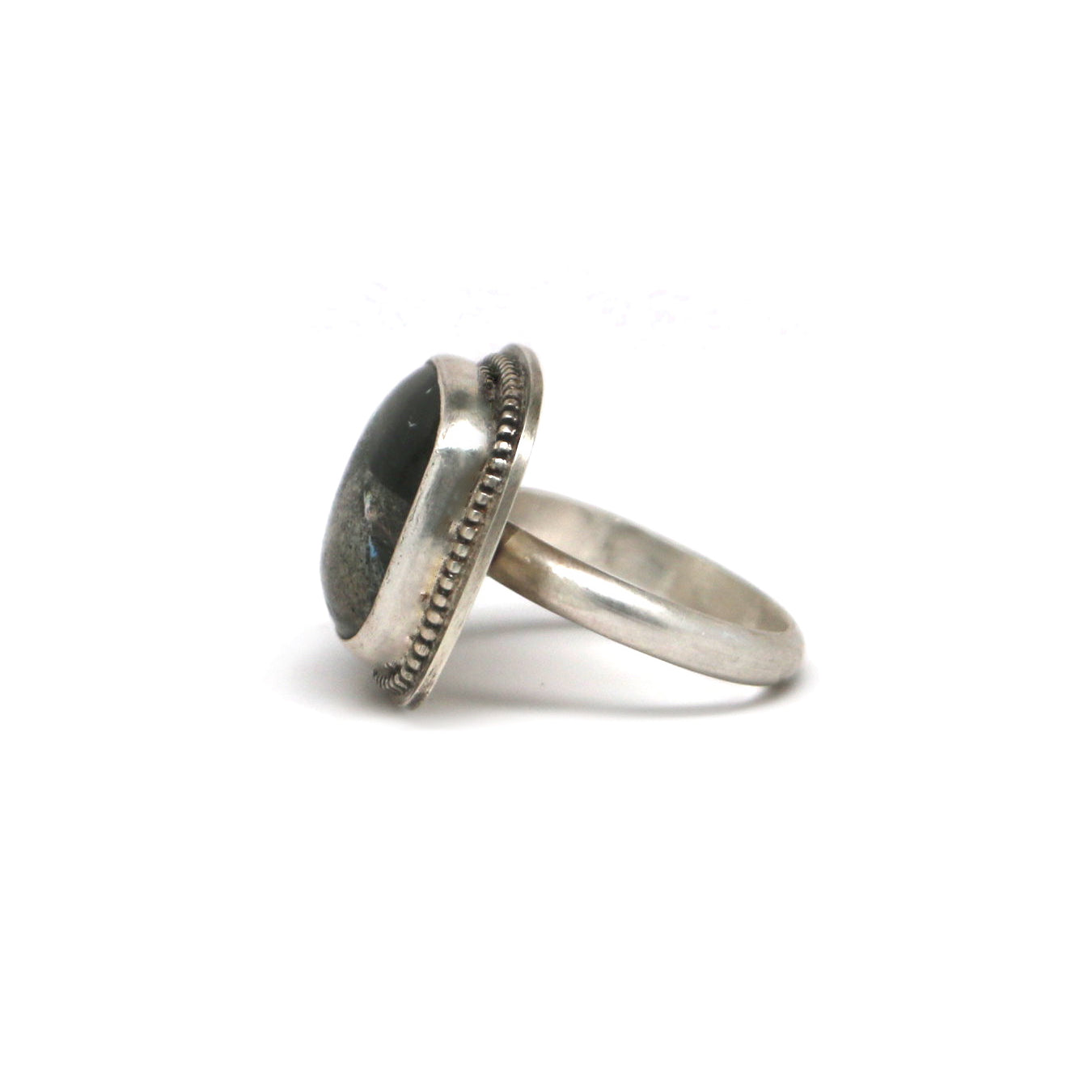 Set in sterling silver with a smooth band.