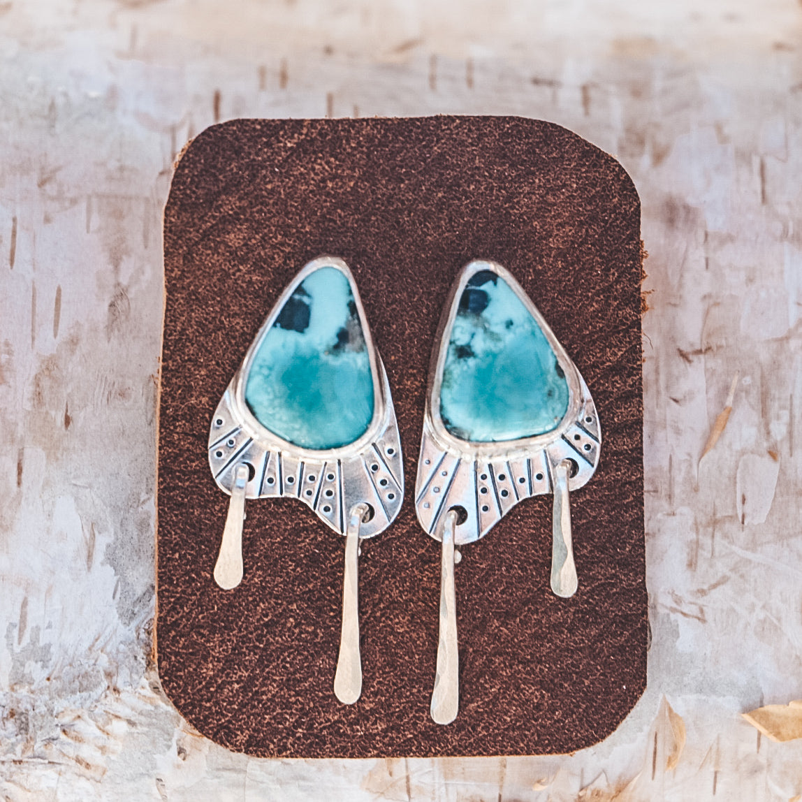 This pair of Baby Fringe Studs features Campitos Turquoise with a butterfly pattern, and are set in sterling silver and fine silver with handmade fringe. Earrings measure 1.5" in length.