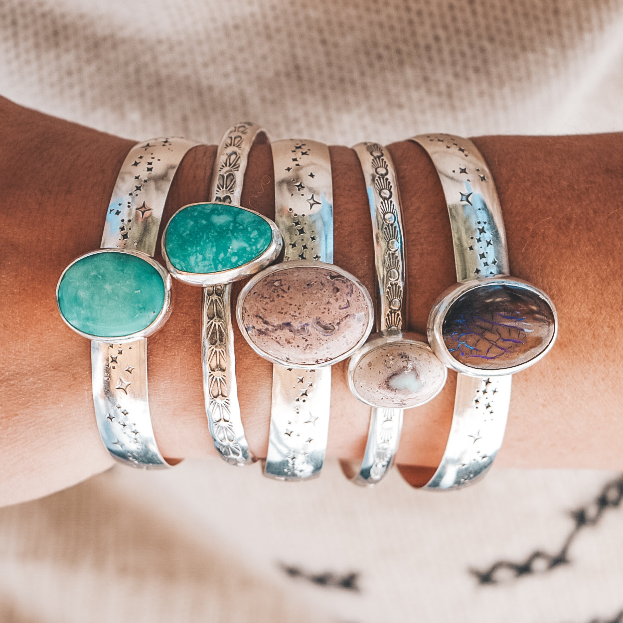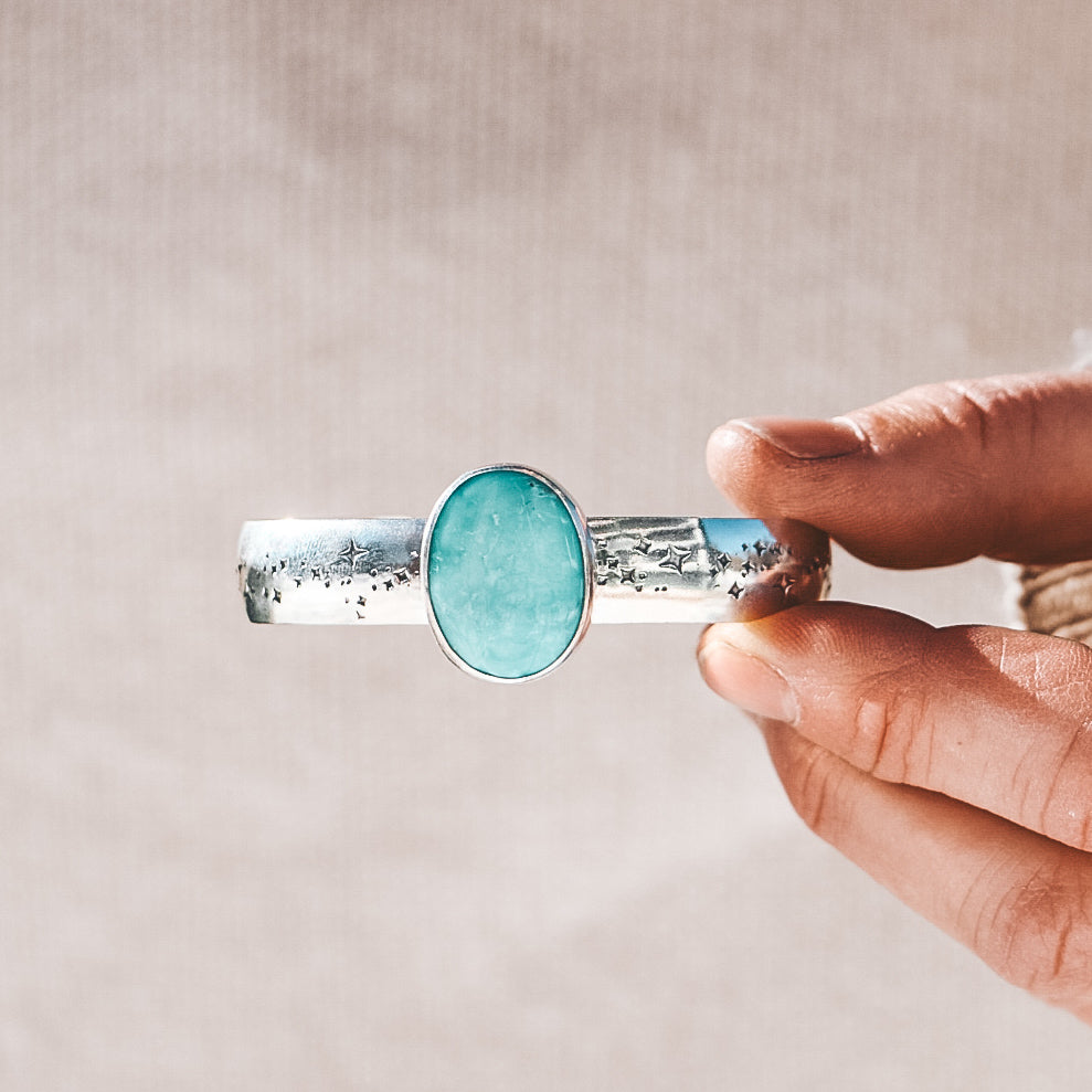 This bracelet is hand crafted by Kate in Aspen, Colorado using semi-precious stones and metals. This cuff is completely one of a kind and you will receive the piece photographed. Cuff will come in a gift box with a travel pouch, polish cloth, and care instructions.