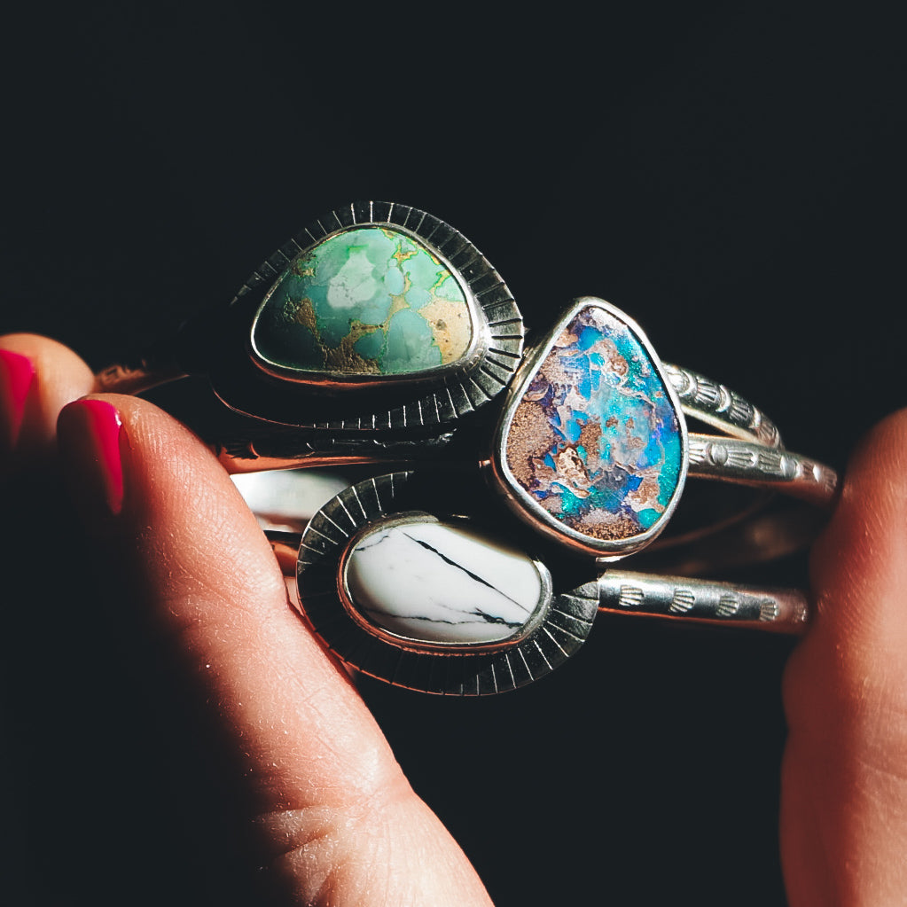 This bracelet is hand crafted by Kate in the mountains of Colorado using semi-precious stones and metals. This cuff is completely one of a kind and you will receive the piece photographed. Cuff will come in a gift box with a travel pouch, polish cloth, and care instructions.