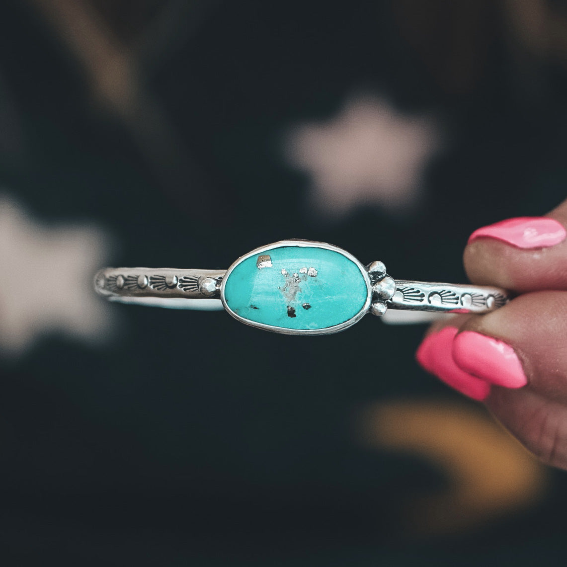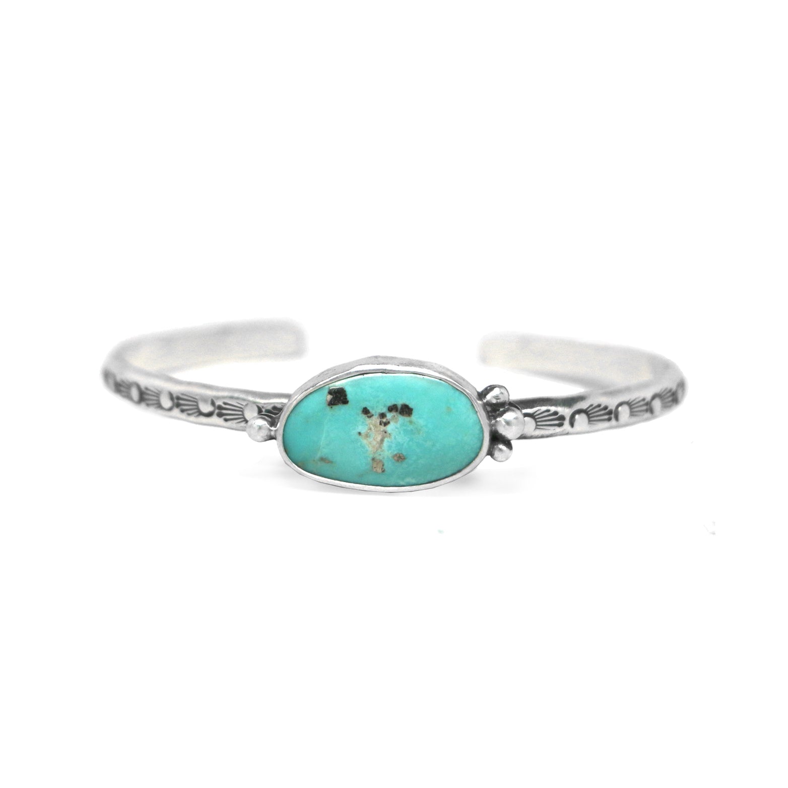 This one of a kind cuff features a brilliantly teal Campitos Turquoise, mined in Sonora, Mexico. The stone has flecks of natural pyrite inclusions. This bracelet is made from sterling silver and fine silver, and features a hand-stamped cuff and silver granulation accents. The stone centerpiece measures 28mm in width and 17mm tall.