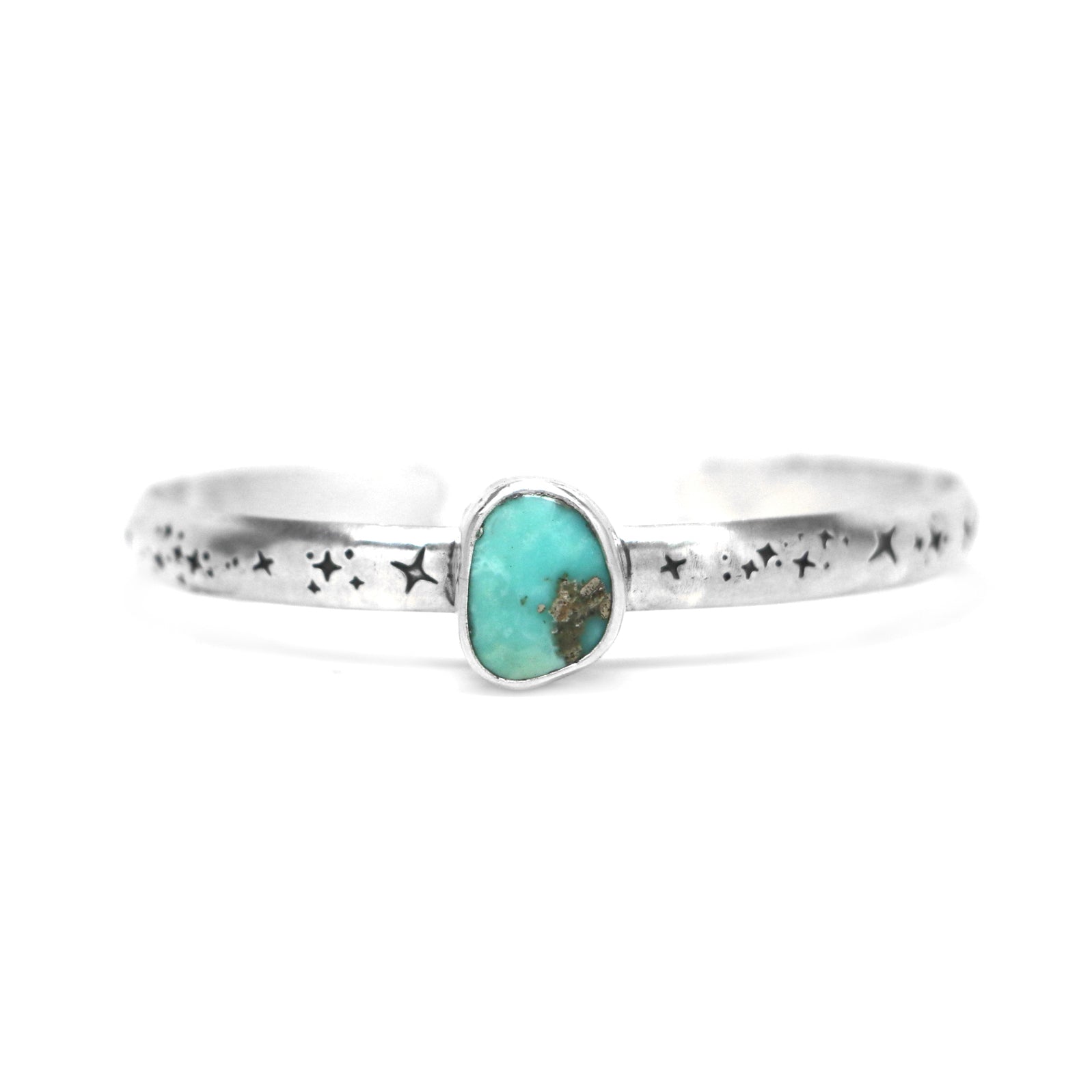 This one of a kind cuff features a soft teal Campitos Turquoise, mined in Sonora, Mexico. The stone has flecks of natural pyrite inclusions. This bracelet is made from sterling silver and fine silver, and features a hand-stamped cuff with a celestial pattern. The stone centerpiece measures 12mm in width and 14mm tall.