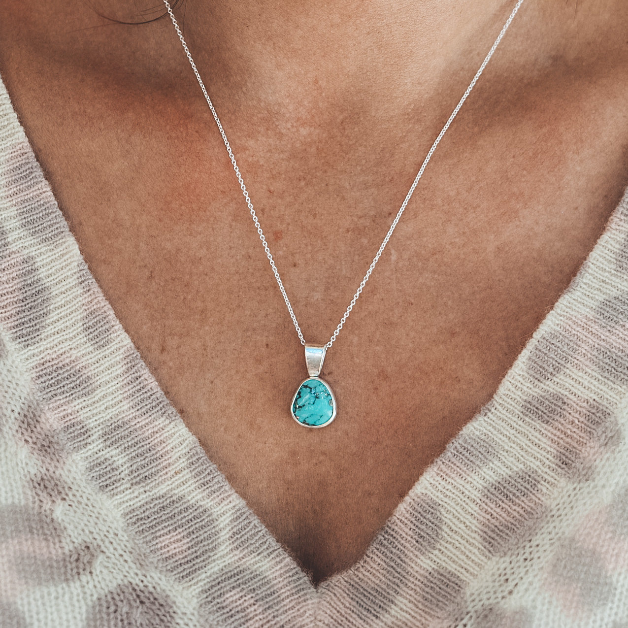 This necklace features Campitos Turquoise, mined in Mexico. The stone is brilliant teal with natural flecks of pyrite inclusions, and is set in sterling silver and fine silver. The pendant measures 21mm tall by 12mm wide.