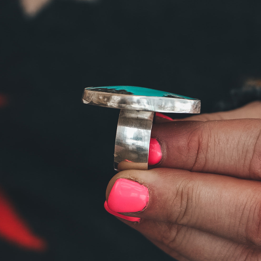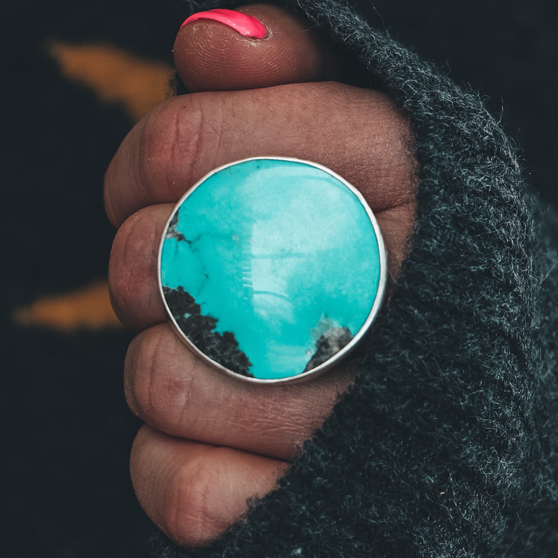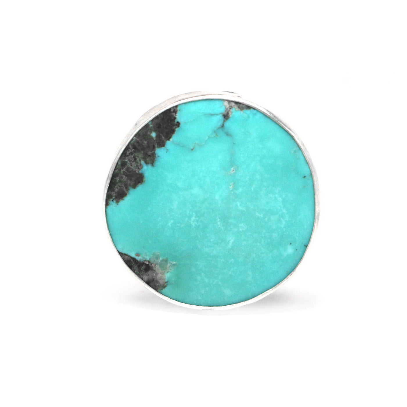 This showstopping, oversized statement ring features a Campitos Turquoise stone in stunningly bright teal with pyrite inclusions.