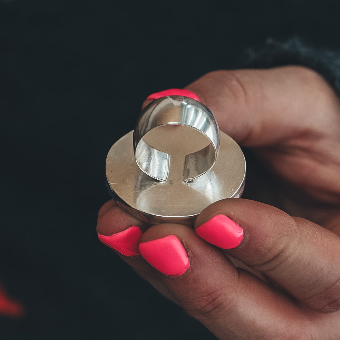 The ring measures 49mm tall by 40mm wide, has a wide band, and is a size 8.25. This ring can not be resized.