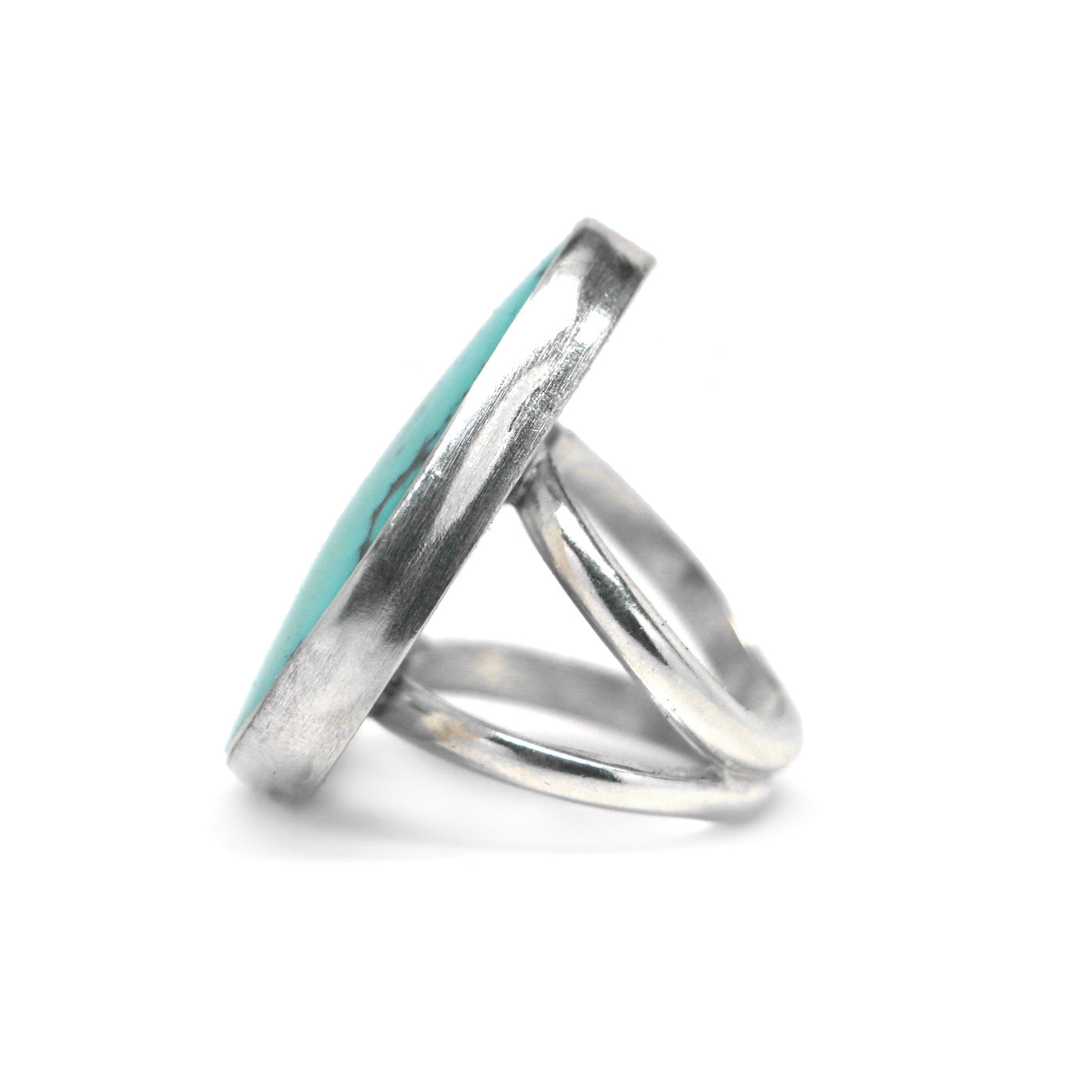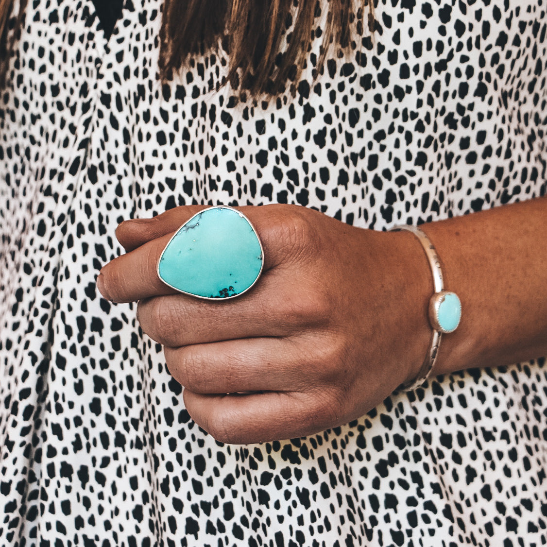 This one of a kind Campitos Turquoise stone is bright turquoise in color with occasional flecks of pyrite inclusions. The stone is set in sterling silver and fine silver, with a wide double split band.
