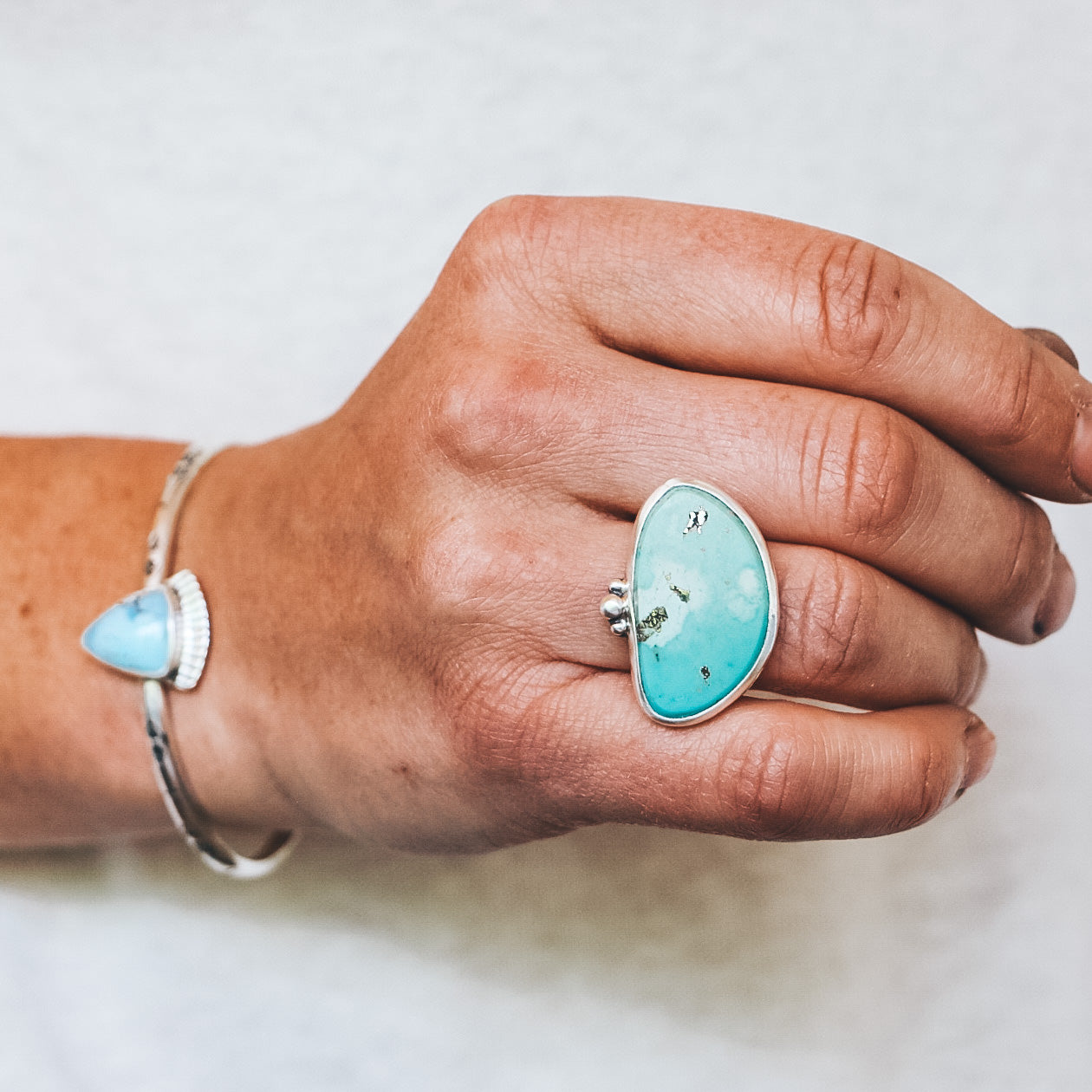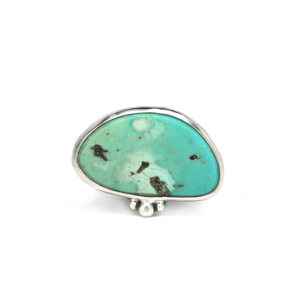 This one of a kind Campitos Turquoise stone is varying shades of light teal with occasional flecks of pyrite inclusions. The stone is set horizontally in sterling silver and fine silver, with a simple, sturdy, half-round band.