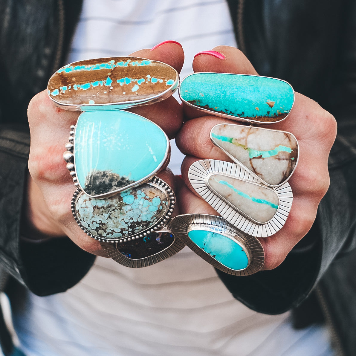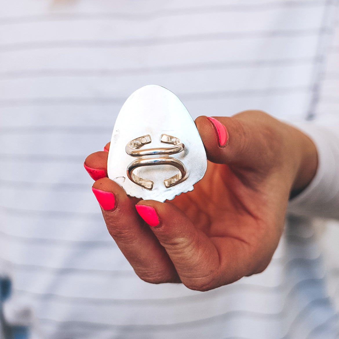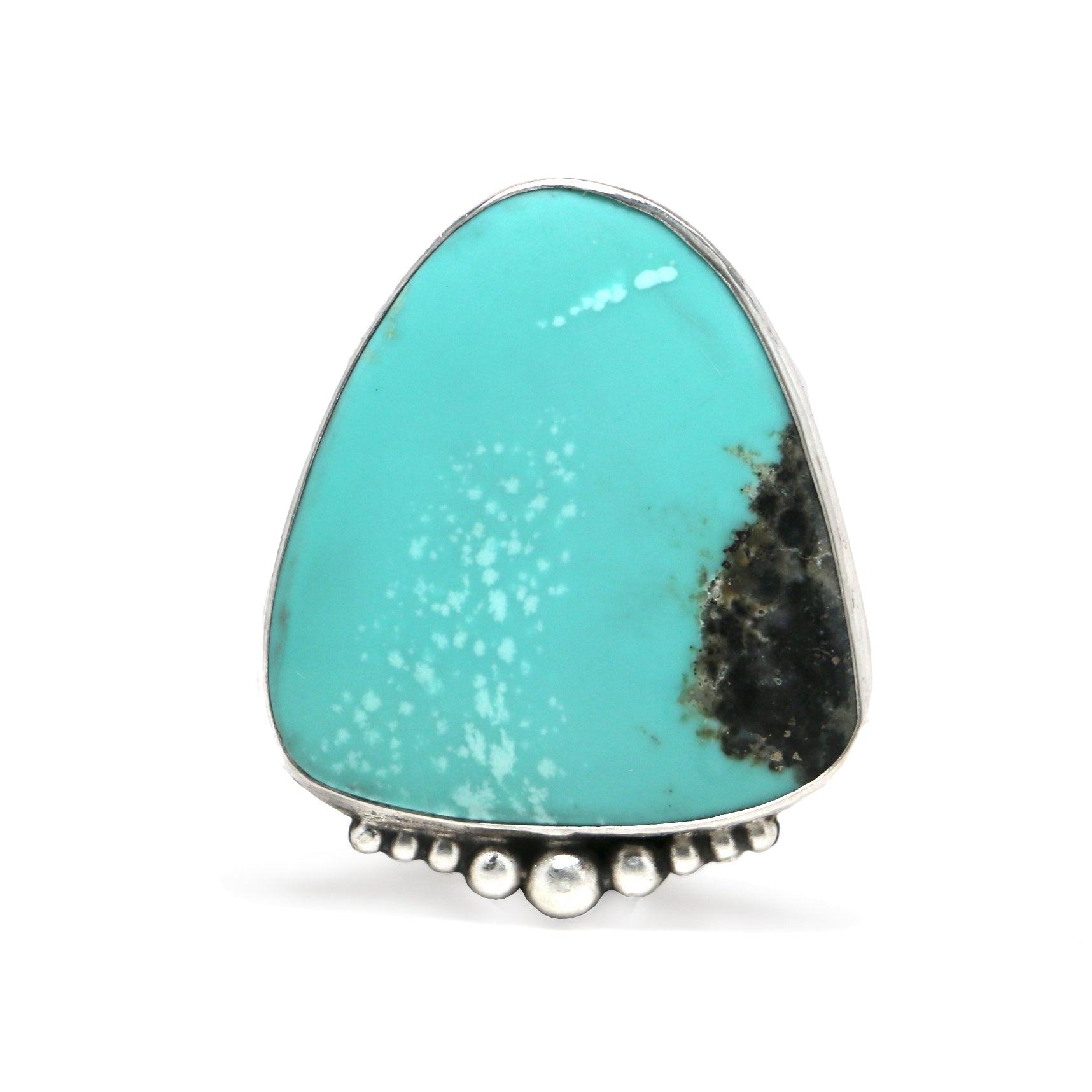 This showstopping, oversized statement ring features a Campitos Turquoise stone in stunningly bright teal with hand-formed fine silver granulation accents. This natural stone has flecks of pyrite inclusions with some white and grey mottling.