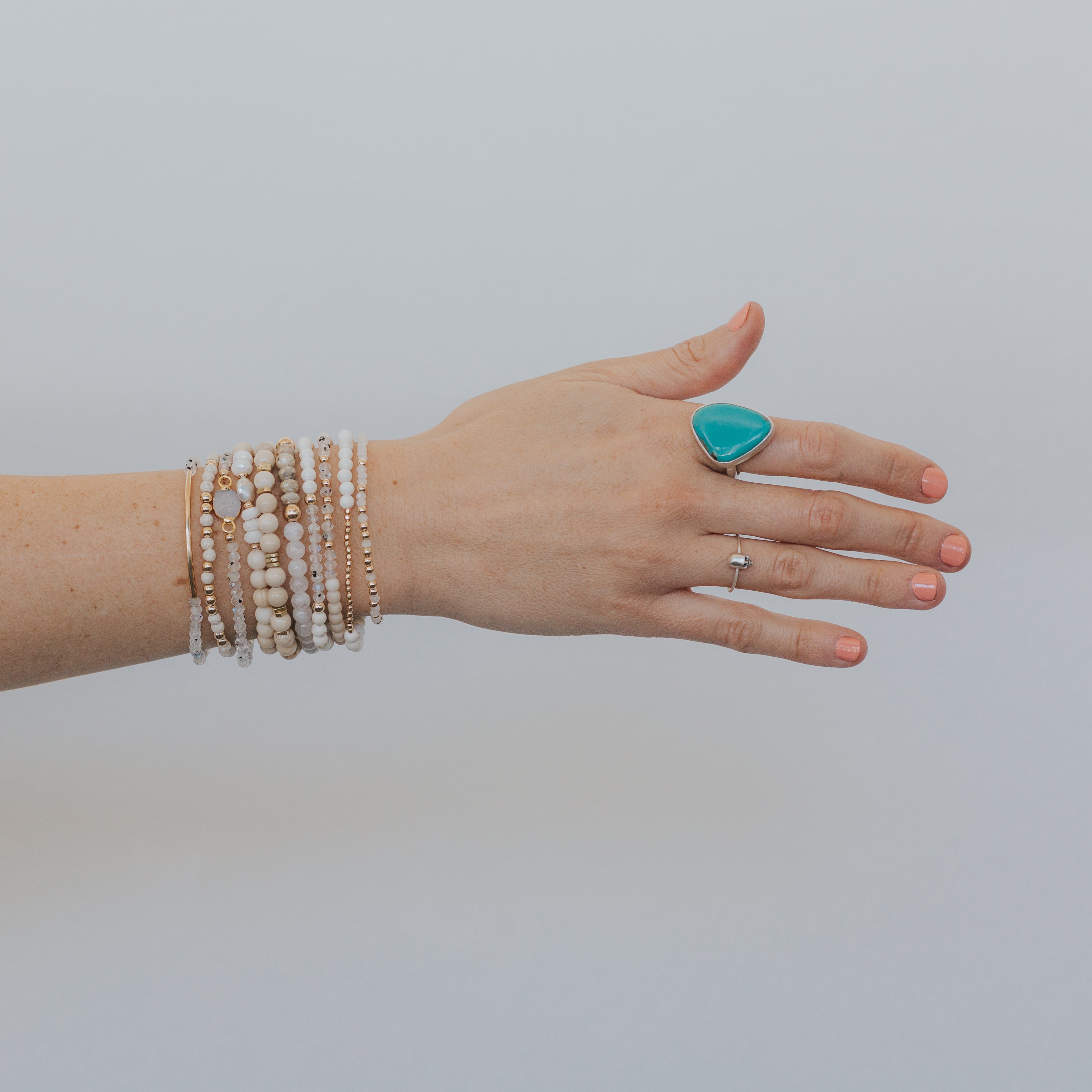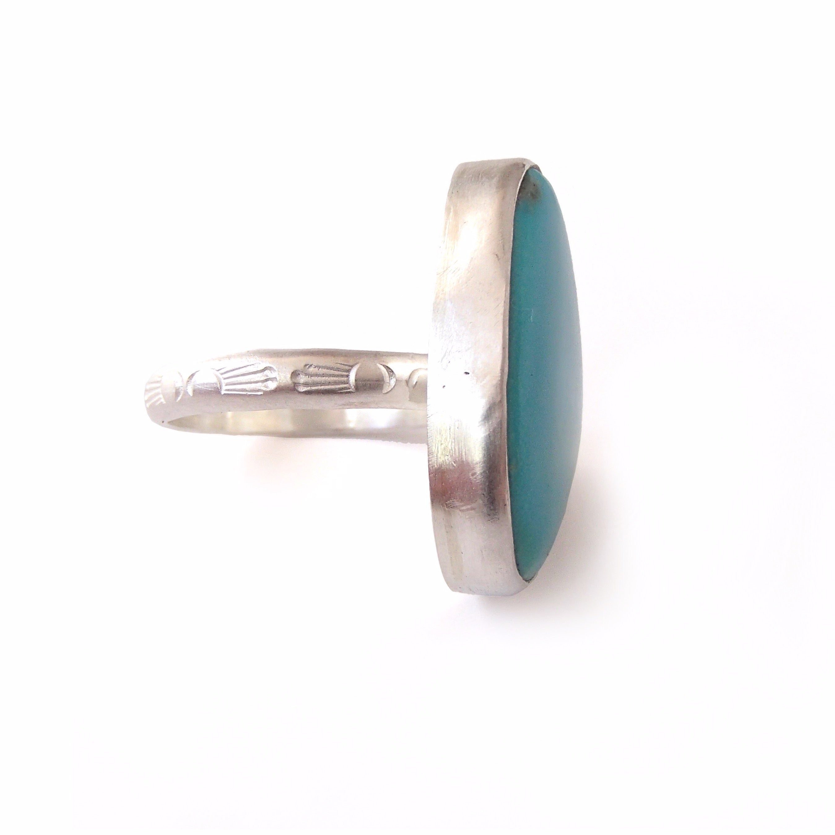 This one of a kind campitos turquoise stone is deep in turquoise color and has a few freckles of pyrite along the edge. The stone is set in sterling silver and the band has hand-stamped pattern detail.