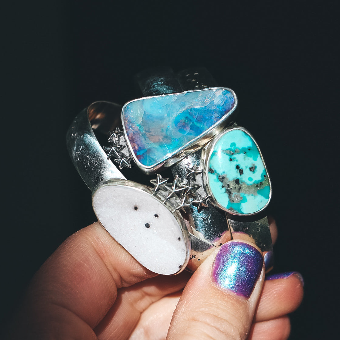 This bracelet is hand crafted by Kate in the mountains of Colorado using semi-precious stones and metals. This cuff is completely one of a kind and you will receive the piece photographed. Cuff will come in a gift box with a travel pouch, polish cloth, and care instructions.