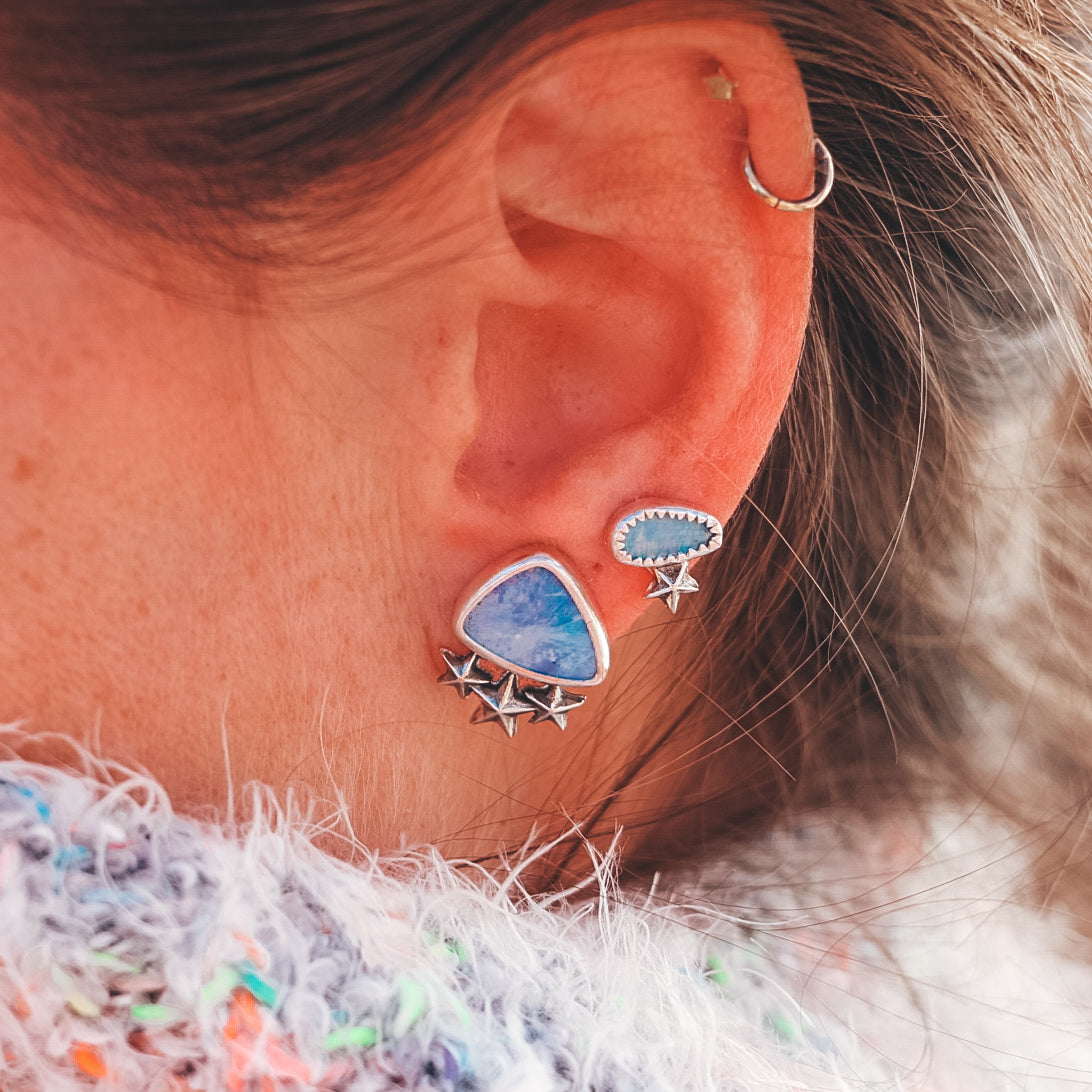 This single stud features an Australian Opal Doublet set in sterling silver and fine silver.