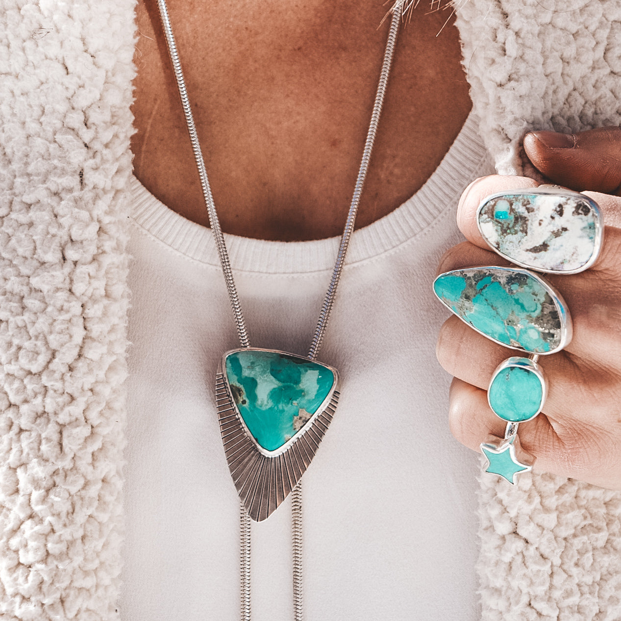 This bold necklace makes a statement and can be worn at any length up to 36"! This piece features Campitos Turquoise and is made from .925 sterling silver and .999 fine silver