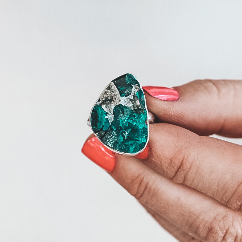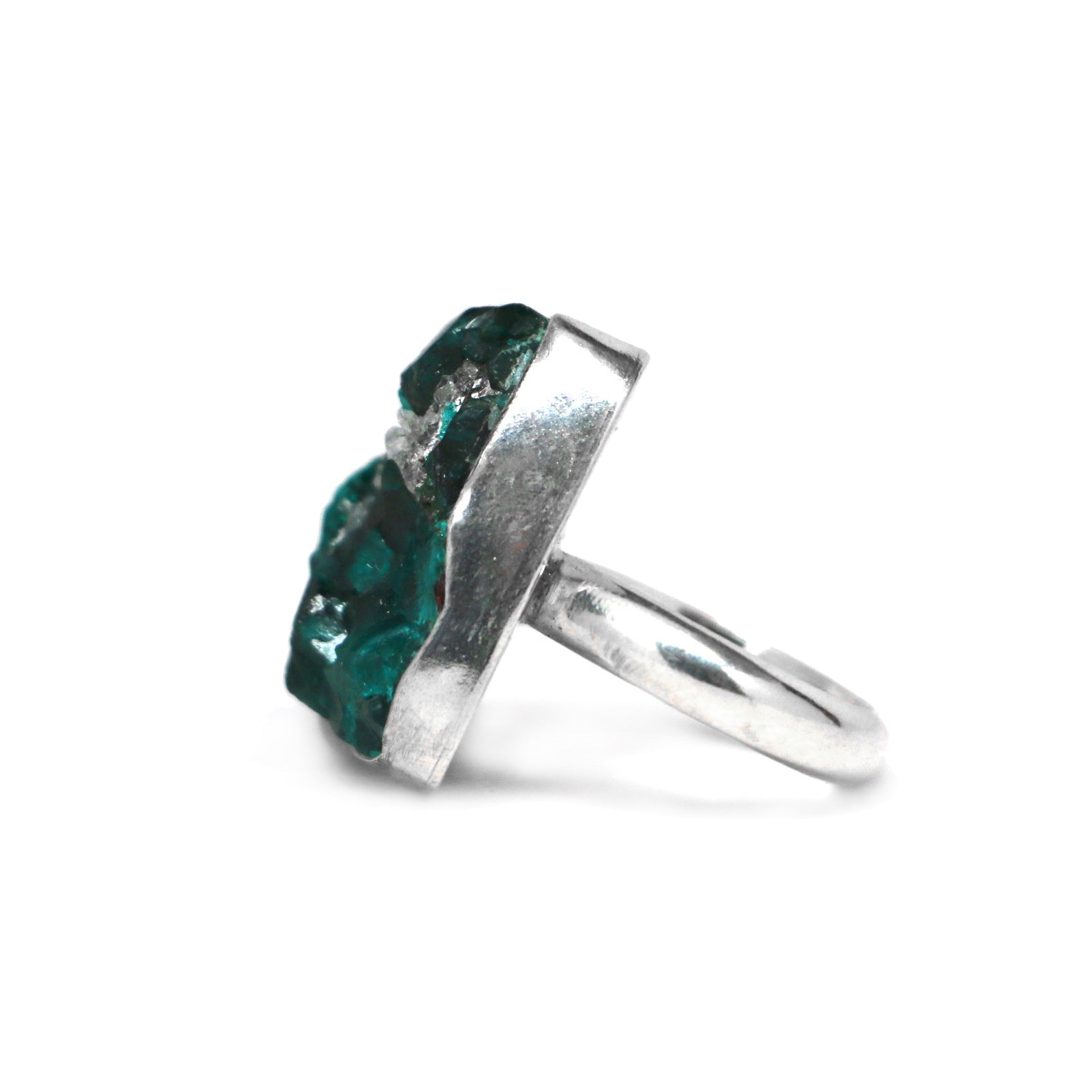 This simple statement ring features a rough surface Chrome Diopside, which is emerald green with pockets of light grey druzy.