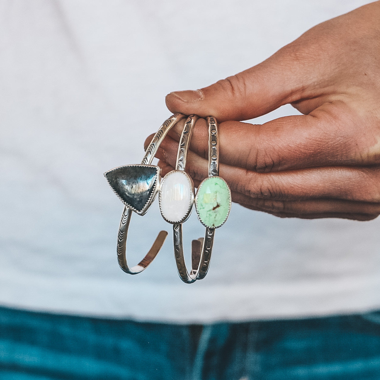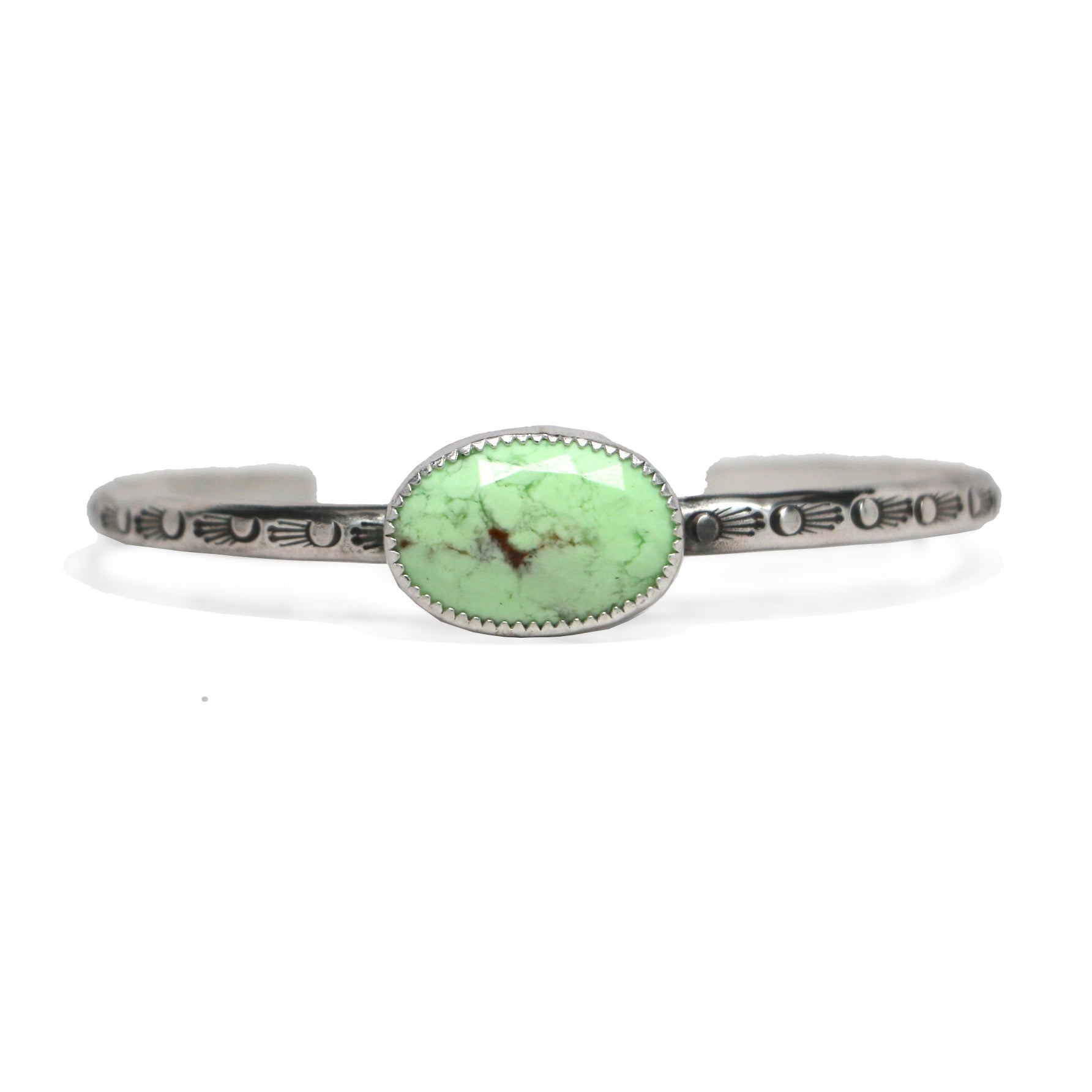 This one-of-a-kind cuff features a bright green Chrysoprase stone. The stone is faceted and has natural brown and dark green veining. This cuff is made from sterling silver and fine silver, and features a hand-stamped band.
