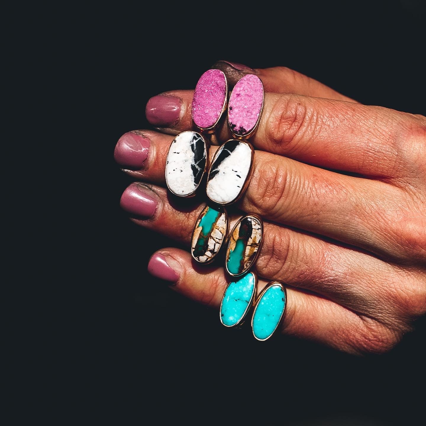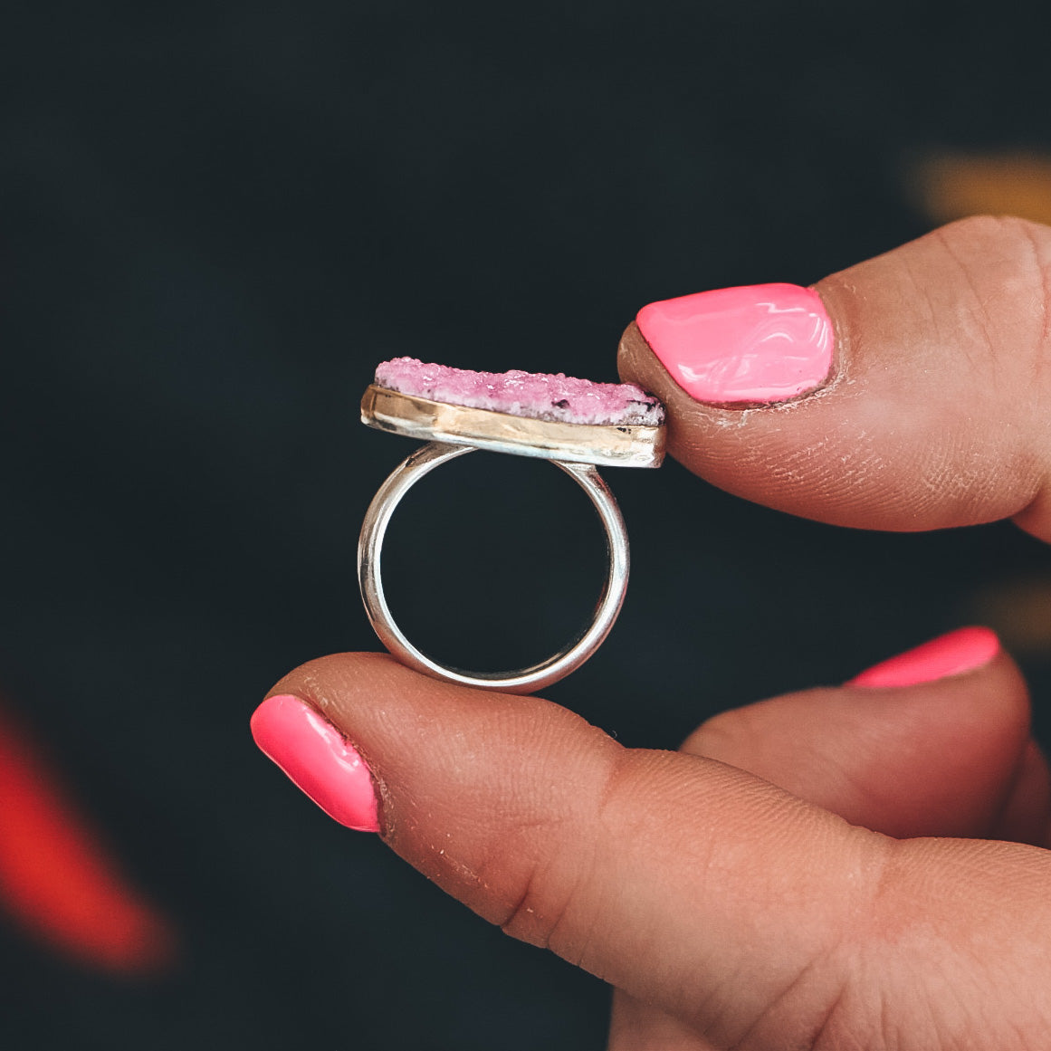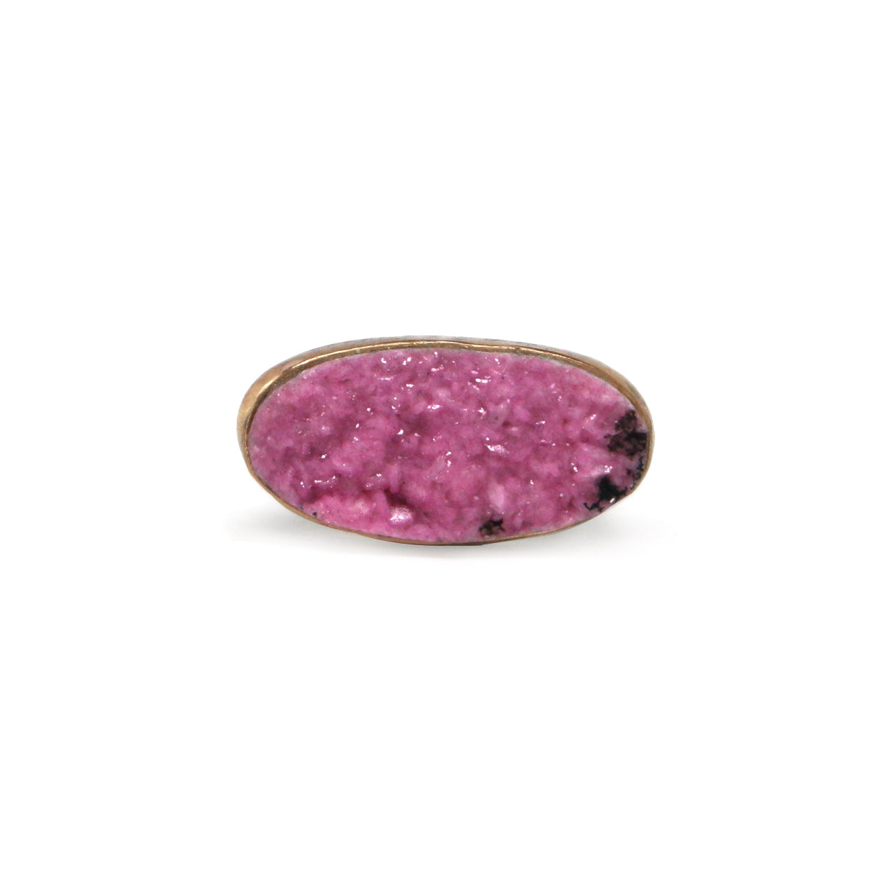 This horizontal Latitude ring features a Cobalto Calcite stone, which is naturally bright pink and has an irregular druzy texture.