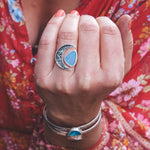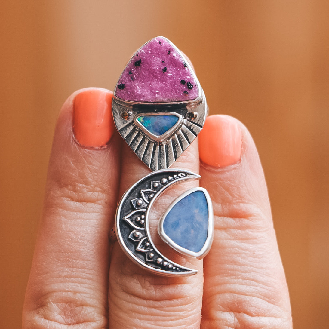 This ring is hand crafted by Kate in the mountains of Colorado using semi-precious stones and metals. This ring is completely one of a kind and you will receive the piece photographed. Ring will come in a gift box with a travel pouch, polish cloth, and care instructions.